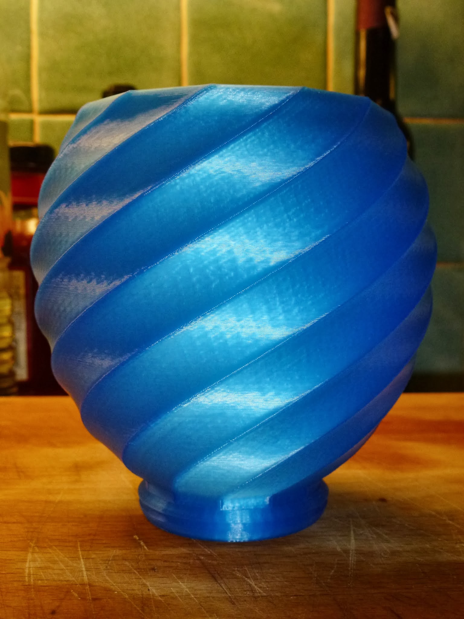 CoreXY, .2mm layers, Jet Translucent PLA, KISS 1.1.0.8 in “vase” mode, 1mm skin, 200+mm/s with aggressive cooling. The facets in the grooves are intentional.