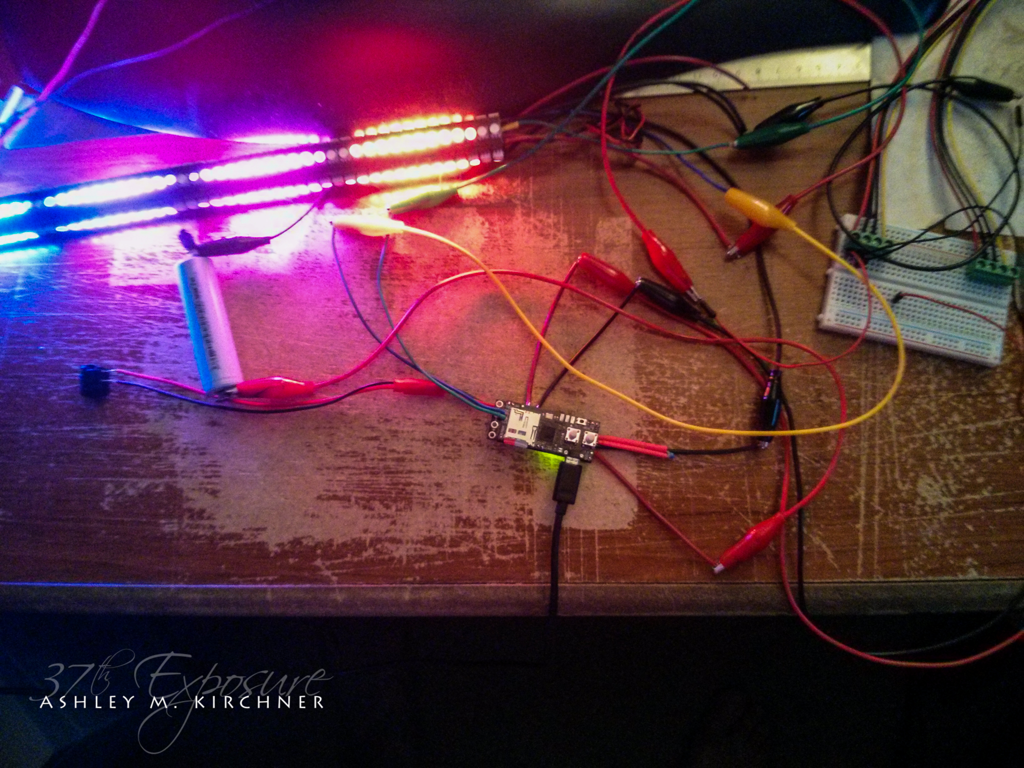 Sometimes all I have to work with is spaghetti. On the left is the battery. On the right, coming from the breadboard is 5V (which is actually doing nothing at the moment because the battery’s fully charged already.) In the middle are the control module and power module married together and the USB cable connected for programming. Having a trigger happy button that will likely need to get replaced, and it can’t read the SD card. But hey, figured out (and solved) why it wasn’t enumerating. Small progress! Just the simple fact that the power module is doing I’m expecting it to do is a big achievement! From being able to charge from USB or DC_IN, boost the battery to 5V for the controller, and when turned off, it also shuts off the USB controller on the AVR, which is an additional piece of circuitry I added. I’m a happy camper right now.