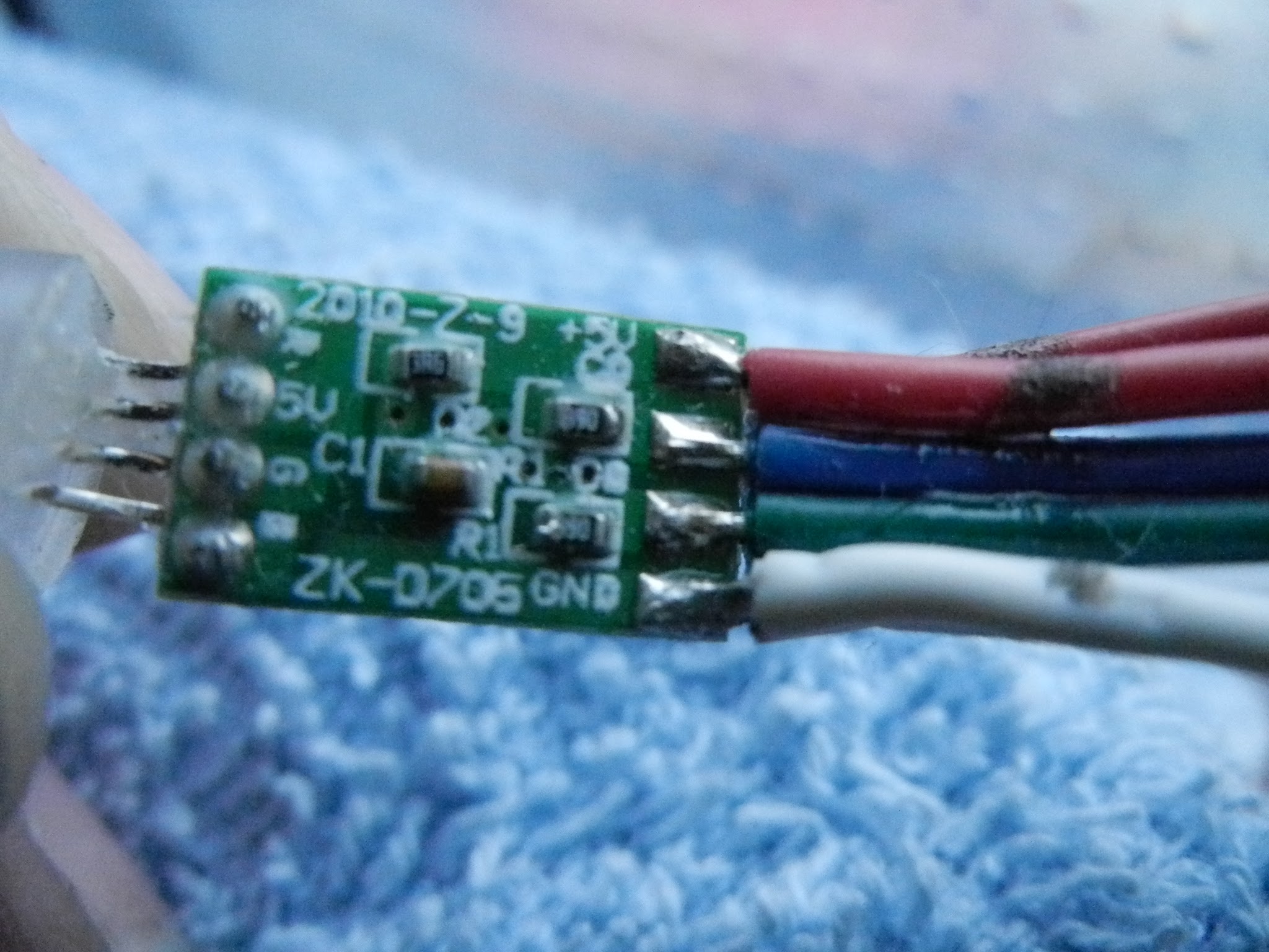They are sealed in silicon. I extracted the one on the foto on the left. 5V red wire-gnd white wire-clock blue and data green wire. I knew that they need seperate 5 Volt and gnd to the pixel and the arduino. But it seems that I do something wrong or don´t know about the Pixel o the code to run them.