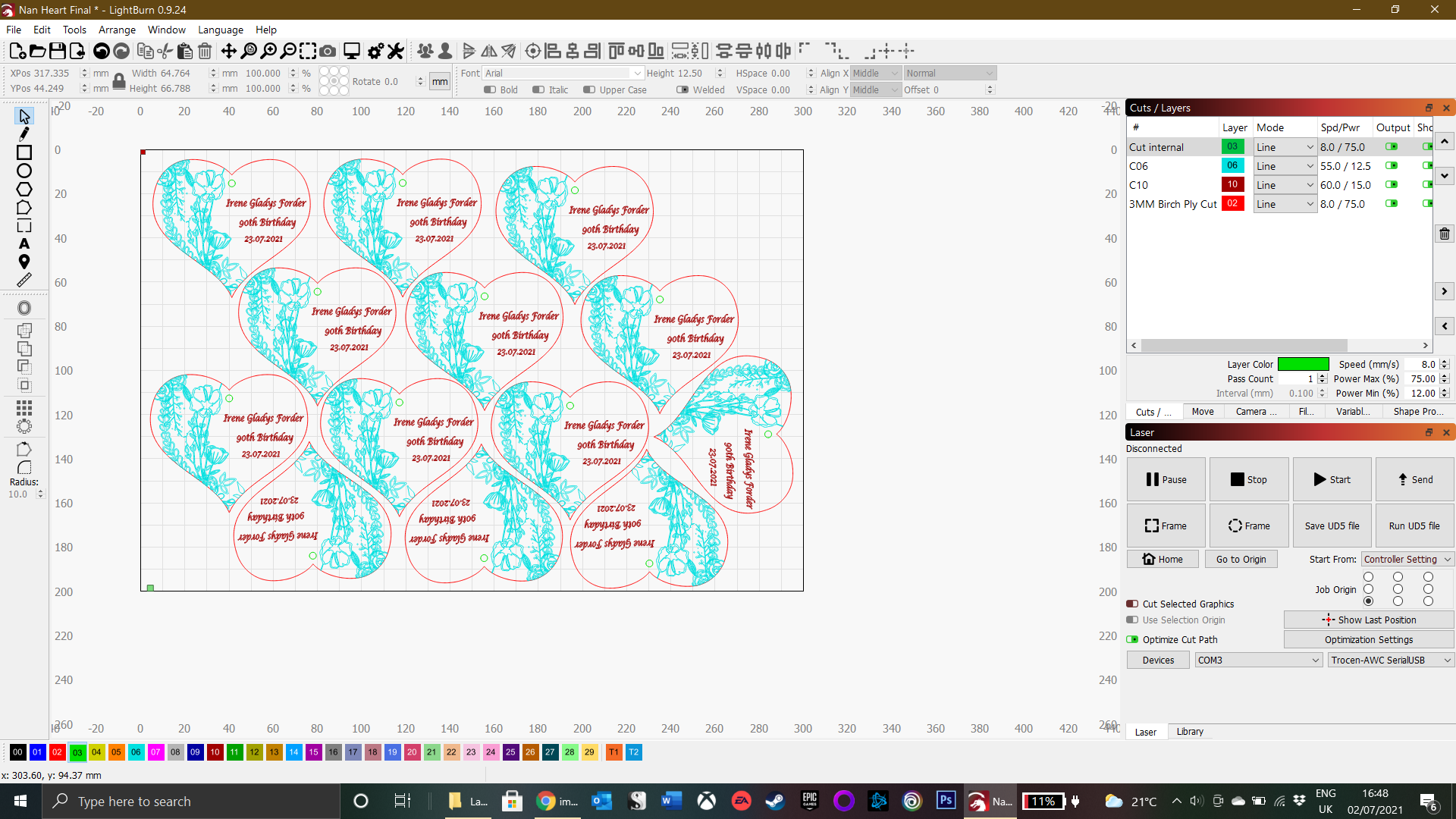 After putting it back together I cut some Christmas decorations (always be prepared), made a few boxes for the bits I keep around the laser and then a few card trays. Everything cut perfectly and was all great, however, I then thought I should make a start on a little project for my wife’s Nan.