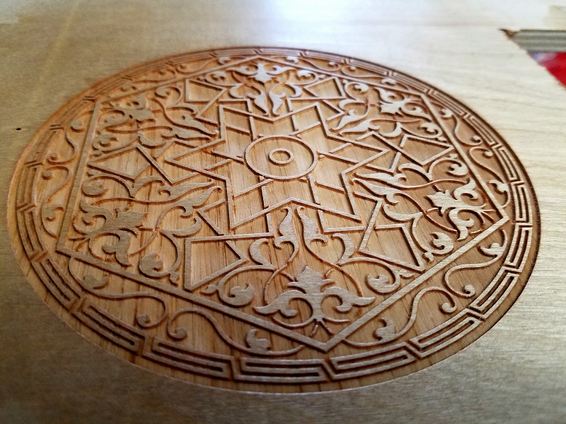 Test in Baltic Birch plywood of a pattern that came out a lot better than I expected with very few breakouts. I edited the vectors from the last version I posted to make it all clockwise closed curves and plan on a larger reverse version using inlay pieces for the pieces that stick up in this cut.