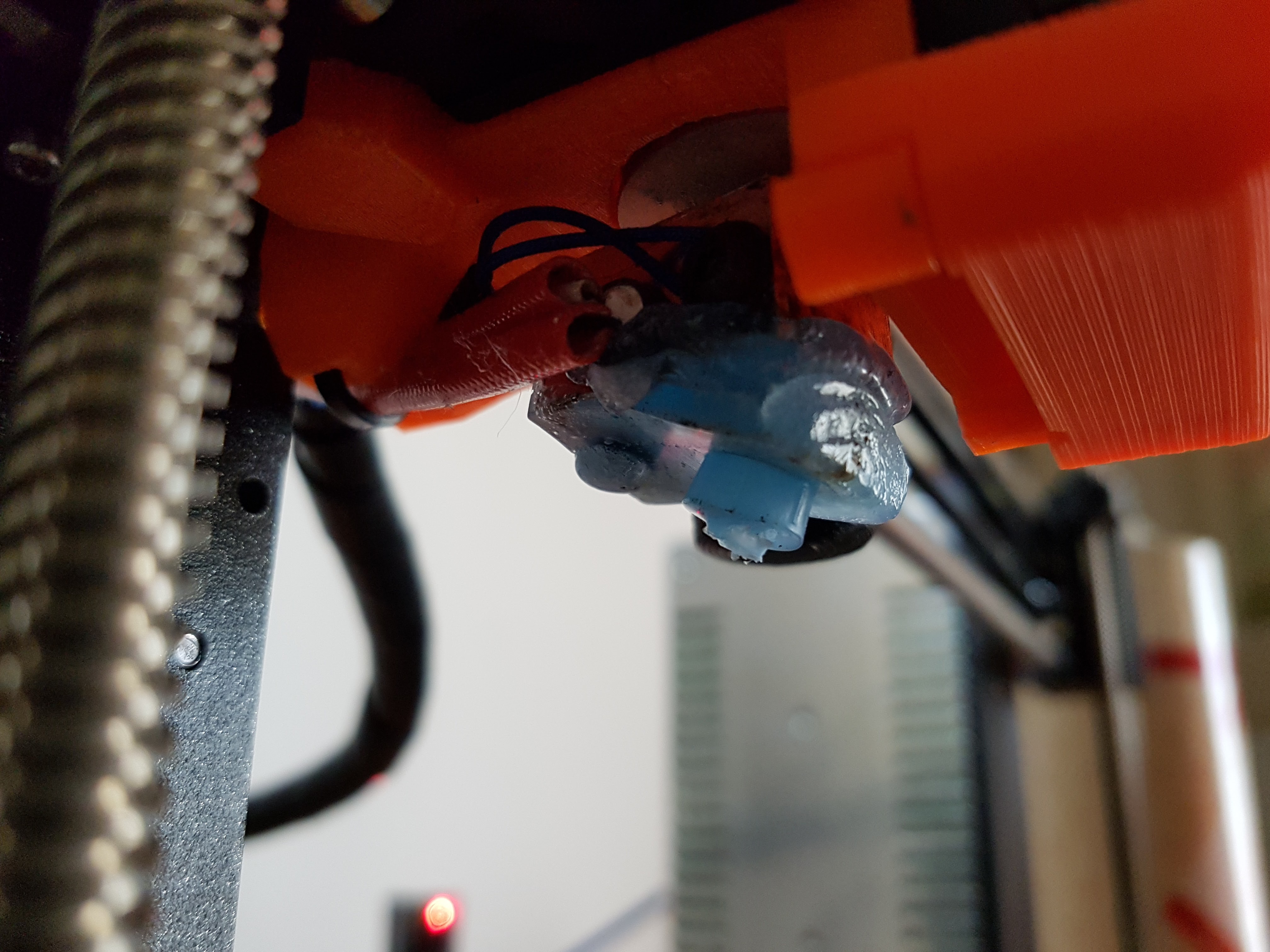 That’s what i call the “under extrusion” I can blame only myself. When I want to use new E3D V6 silicon socks on the old layout V6s (so with extra cut off), I should fix it with the wire. (After some time the sock softens and the mishap begins.)