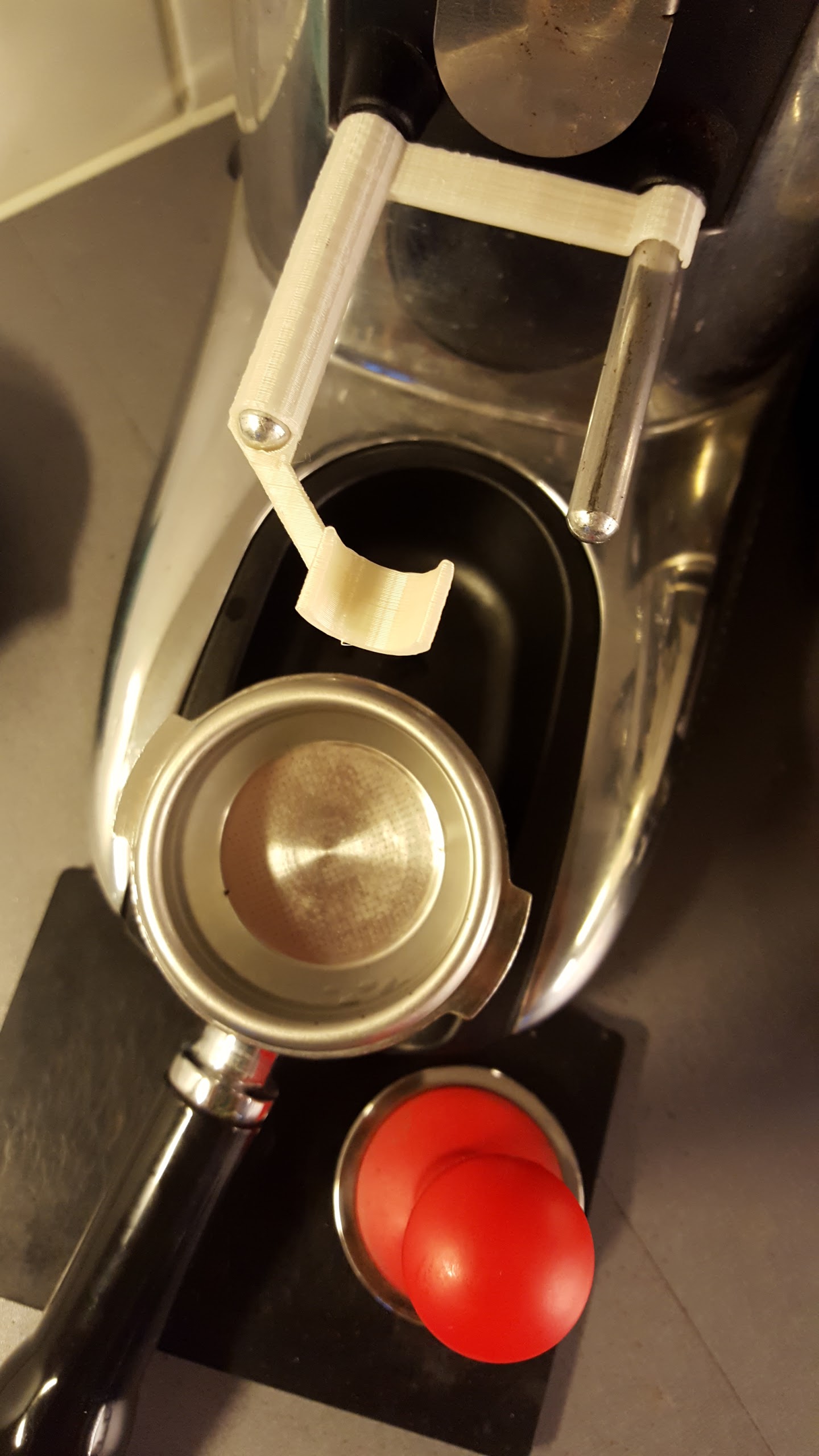 The hardest design issue was fitting the holes around the not entirely parallel pegs in a way that gives a snug fit while being strong enough to support the portafilter handle weight on the hook at sufficient distance to clear the spouts on the underside of the handle. First three designs were too flimsy and broke.