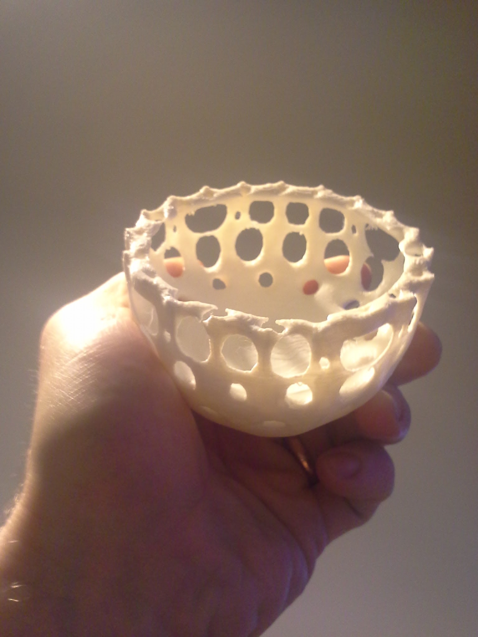 The first 3D printed object that I designed. Printed on a RepRap - designed with some Processing.org code using toxilibs.