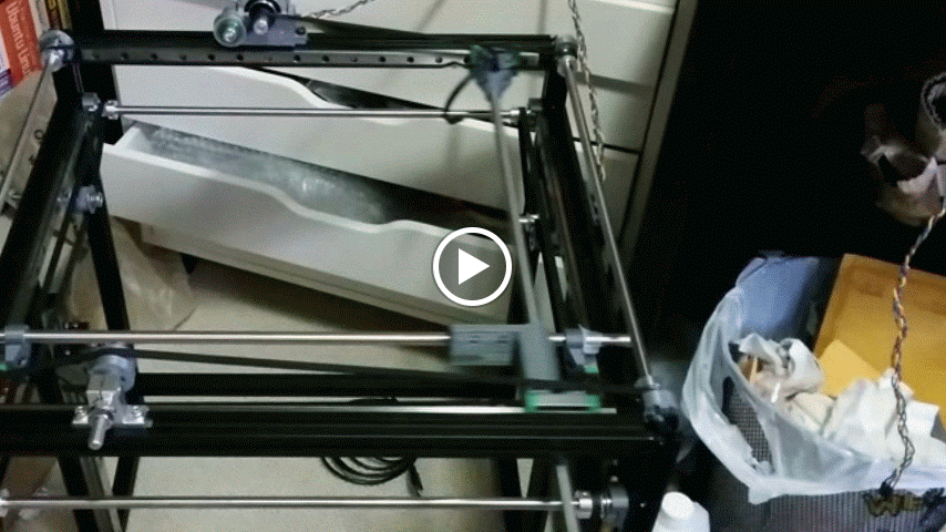 The first automated moves on my new printer, which I am calling “Machigai” . Machigai is Japanese for “Mistake”, as I have made many during the design of this printer. The frame and basic design is from the Ingentis, but I am using linear rails for all axes. Inspiration was taken from many places to design the mounts, but they are of my own design, so when they fail, I have no one else to blame.