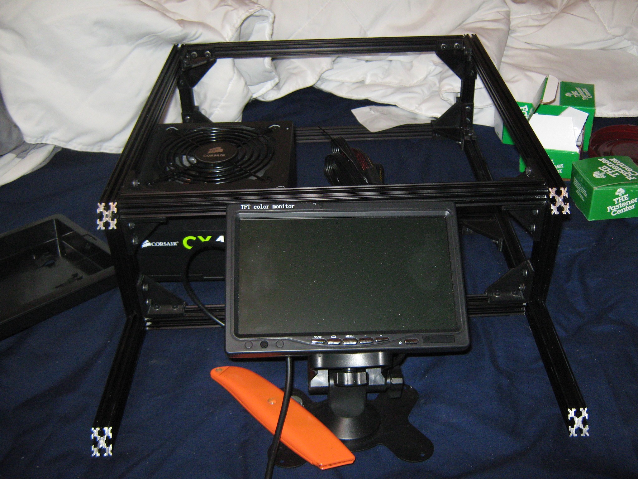 The idea is , it will be enclosed with the ATX switch accessible around the left side. It powers on everything (35A supply) the pi for octoprint, the lcd for the pi. And both RAMPS inputs. Right now this thing is deadly. I did a good job cutting and those edges are deadly sharp. But I am going to fab a face plate to mount to those 45 degree cuts (that line up pretty well considering). All the wires and crap (remember me saying there was an idea to tame the rats nest ? this is it) will be invisible they are in black chinese finger trap wrap and the inside is going to be painted as will the faces. The printer will sit on top with top secret sound dampening (rubber dampeners fashioned from a gell mouse pad).