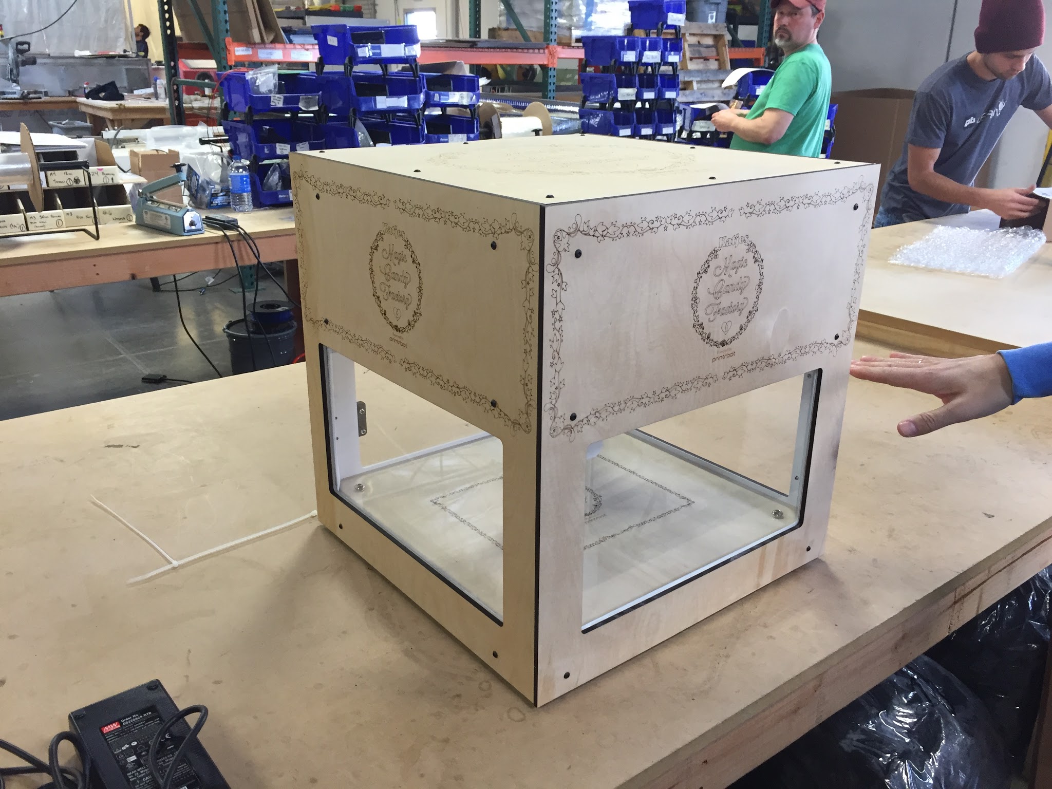 It’s a beautiful machine… We have learned a lot building this gem. It’s a non-final beta so there will be changes, but we are getting close. The wood will be matte clear coated in the final… This just has a light spray of photograph-uv-protecting clear coat. The wood is decorative, matching their branding, the rest is powder coated aluminum and steel. The betas were 100% made in-house at Printrbot. Our local craftsmen-vendors will do the metal and machining for the production models.
