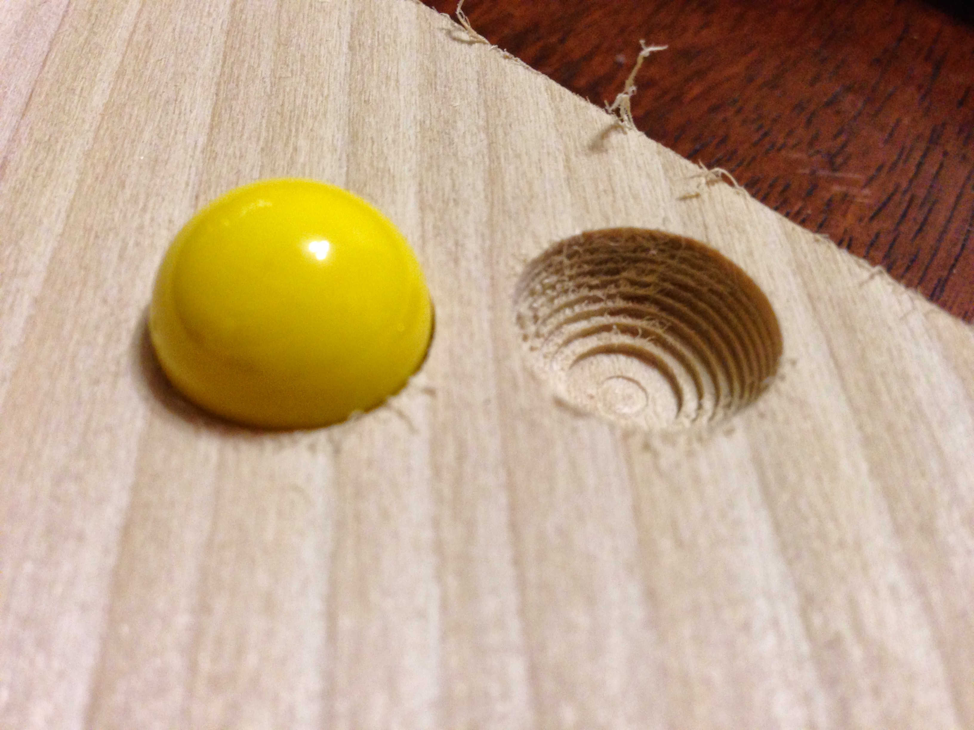 The marble holes project seems to be a success. The holes fit the marbles exactly, so I must have done my math correctly. Even at 1/32", there are visible stairsteps. I can’t decide if that looks cool, or if we should just cut the holes a bit small and sand them.