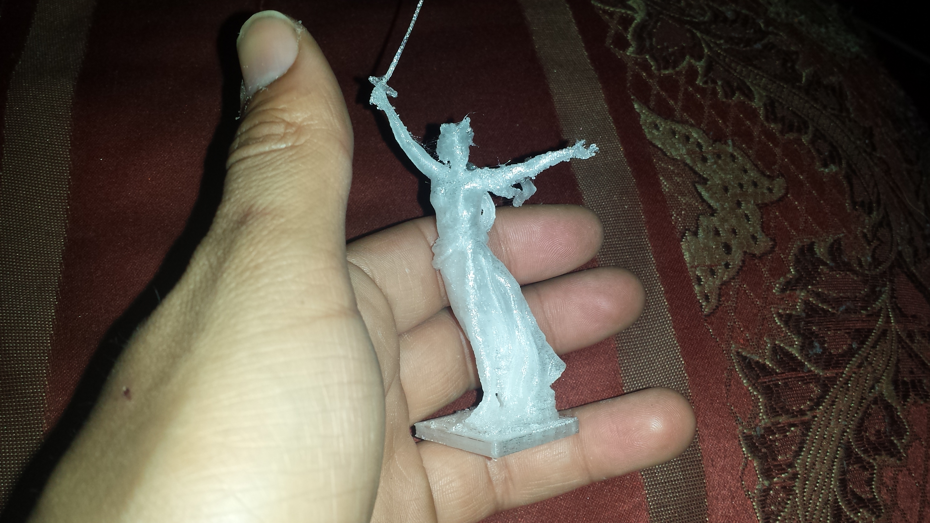 The motherland calls PCTG at 75% scale with pillar supports. I may have missed a couple of bits of support on the head but i stopped pulling because at this scale the neck is too thin and it was beginning to snap.