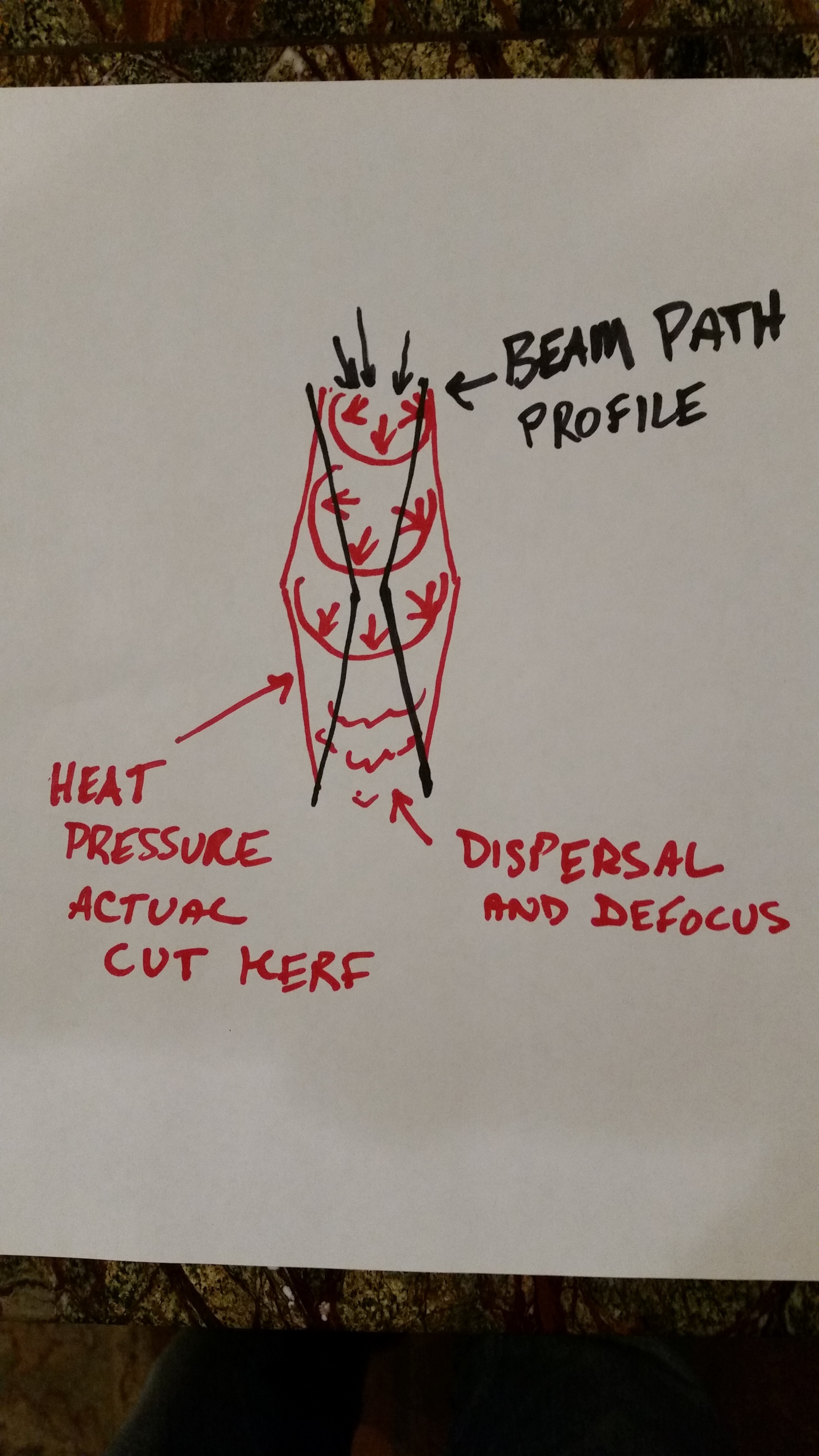 Most of us have noticed when we cut thick wood or plastic the taper we get. But did you notice that it is the reverse of the focal cone of the beam!?
