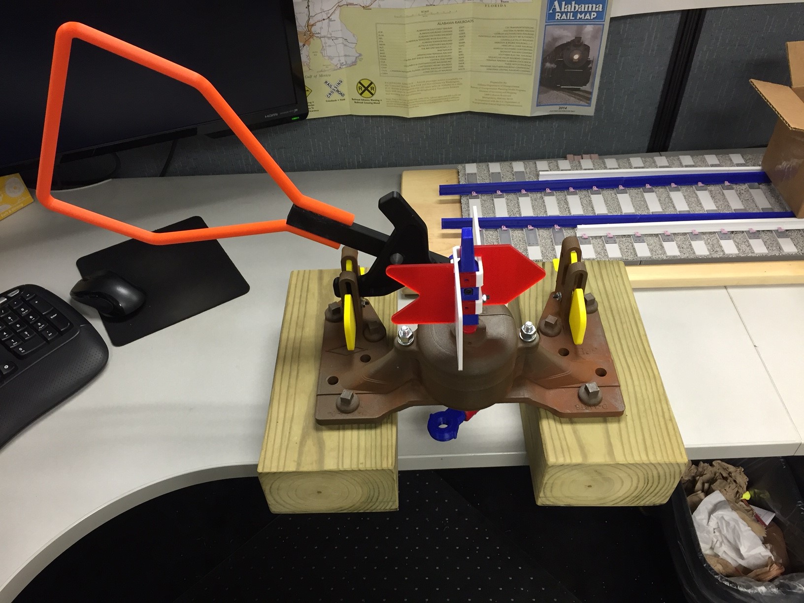 The railroad enthusiasts in the group will know what this is, but in case you don’t know, it’s an R36 switch stand. Printed half scale and completely functional. The only things that weren’t printed were the bolts and the ties. I customized the casing top to have a removable section so you can see the linkage inside. Printed the casing in Proto-Pasta’s magnetic iron PLA. It’s great filament and one of my favorites to use.