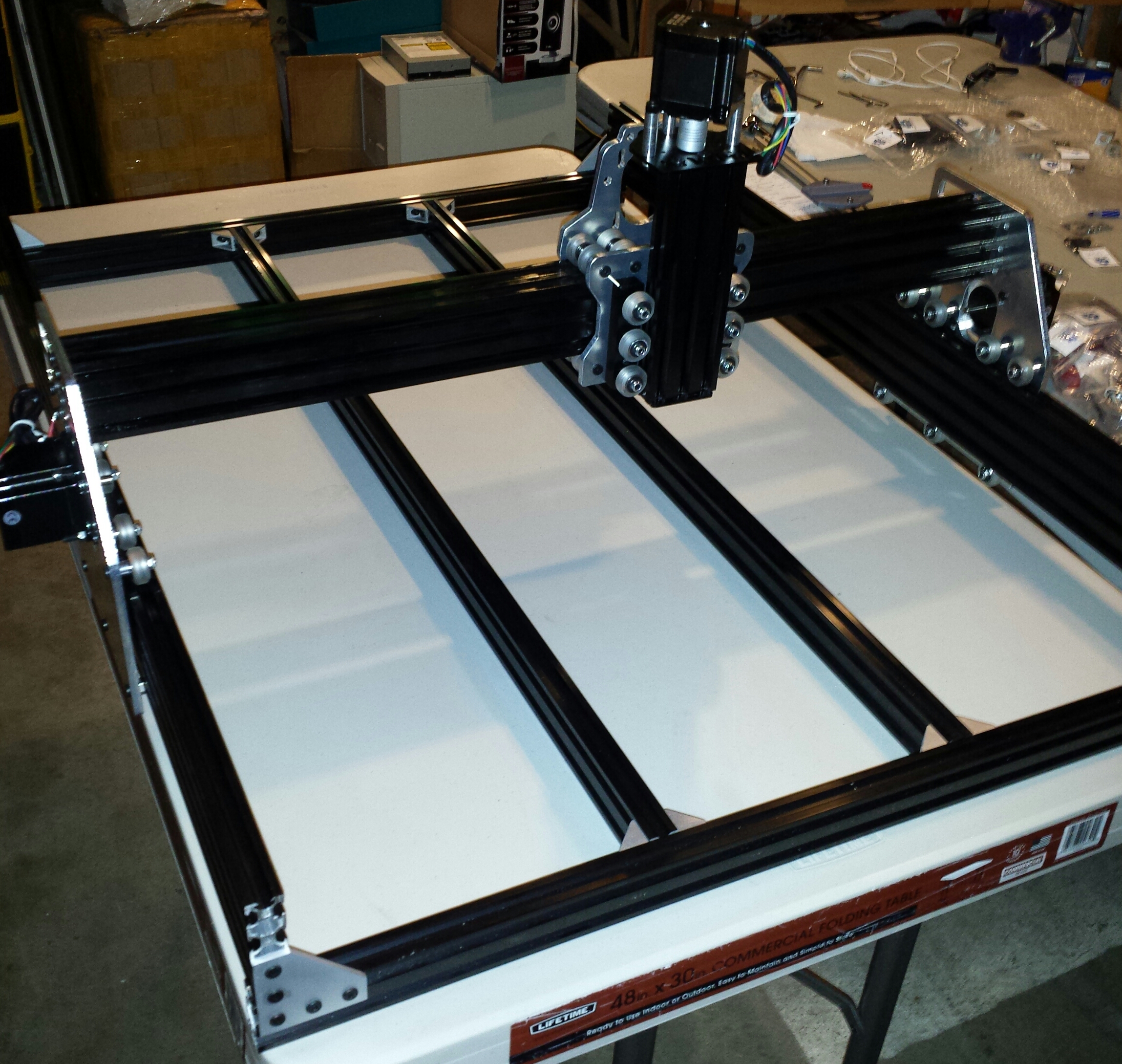 The Z axis is assembled. Hopefully without error. The keen observers here probably noticed I had the X axis crossbars screwed into the wrong holes in the last photo I posted. Doh! (slaps forehead) Fixed that. Next will be putting the filed corner brackets on, and then the pulleys and belts.