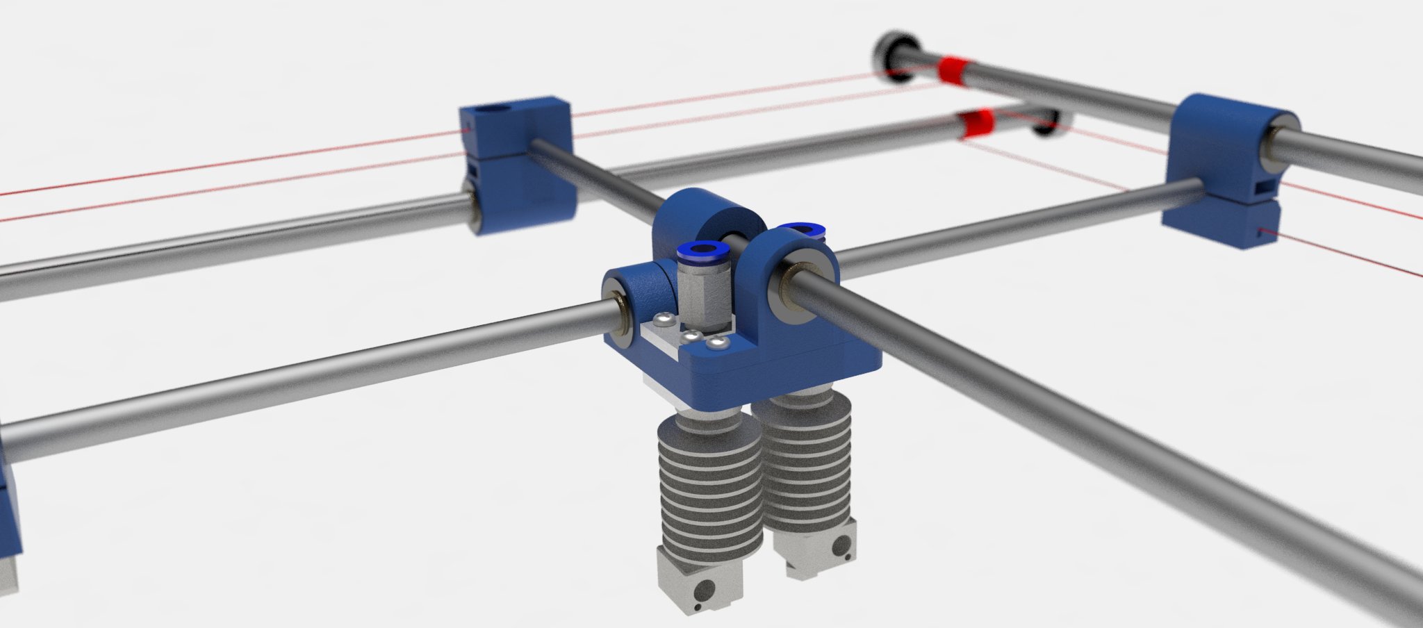 Think I’ve finished the mechanical design for the Big Tantillus. Gave up with GT2 drive belts between motors and rods in the end as I couldn’t find GT2 pulleys with a 10mm bore size (the external rods are 10mm) that weren’t prohibitively expensive. Also got the Carriage footprint down to only 10mm larger than the original Tantillus but with 2 E3D Hot ends as opposed to 1 J-head. Still need to decide on where the electronics, PSU and extruder mounts go…