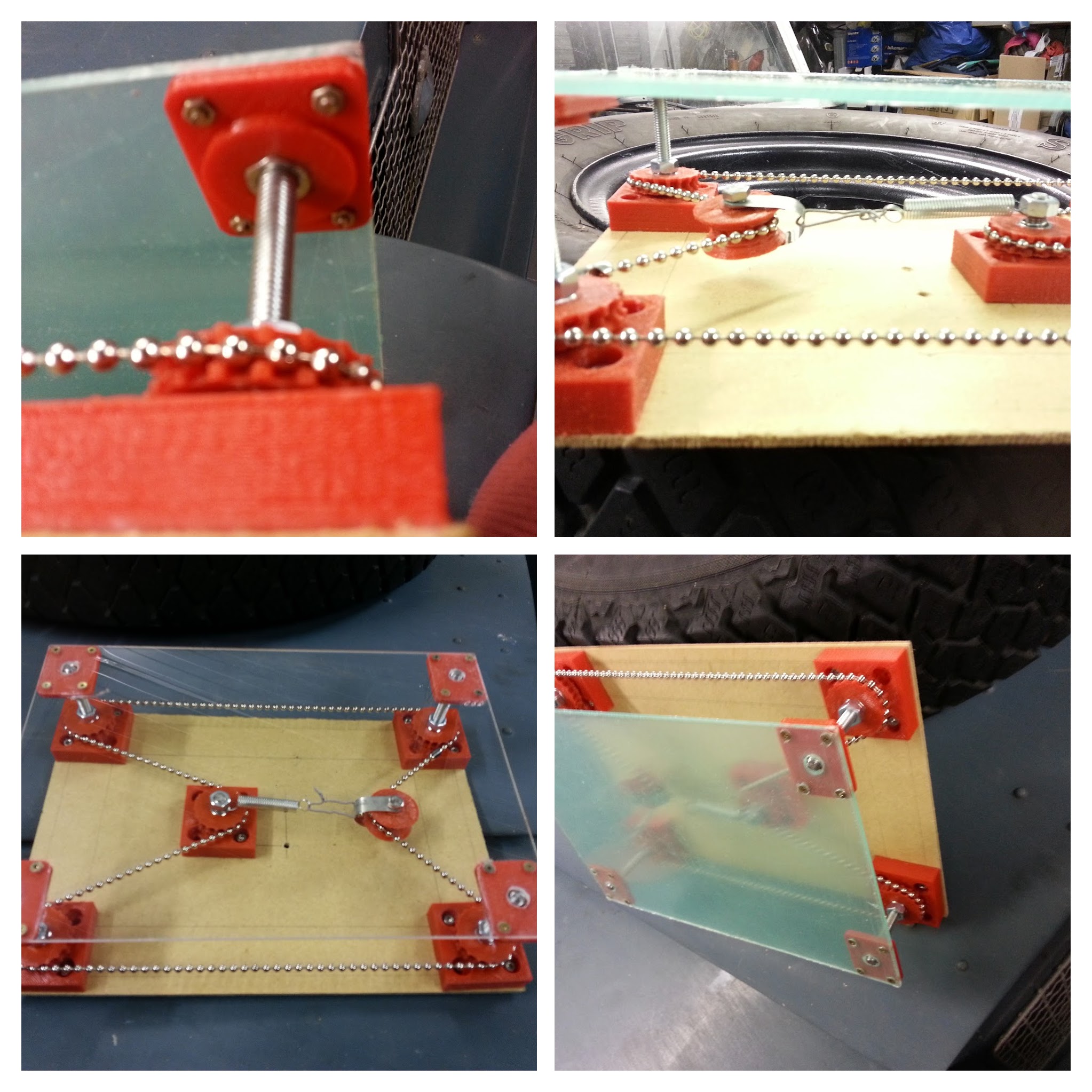 This is a proof of concept mock up for an adjustable height bed for my laser cutter. The idea will be to replace the perspex with the aluminium honeycomb. I would like a motor or handle so it can be operated from outside too. I found the parts designs on thingiverse and printed them in pla on my Rostock.
