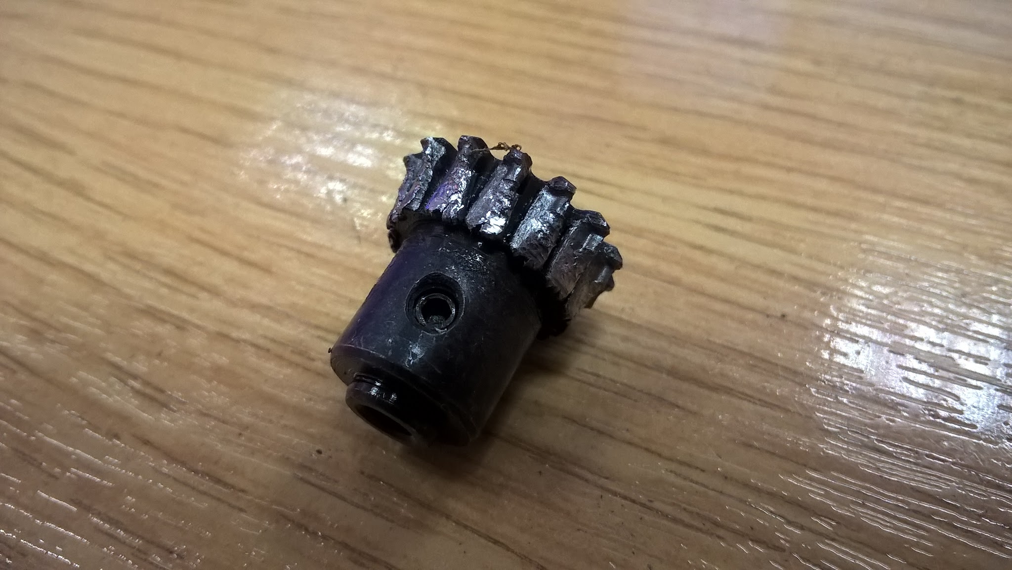 This is what happened to my motor pinion gear after a few minutes…anyone know why a metal gear would do this after such a short amount of use. Gears were meshed, loctite added to motor screws, to motor pinion screw…not sure what else can be done to avoid this happening again…any ideas???