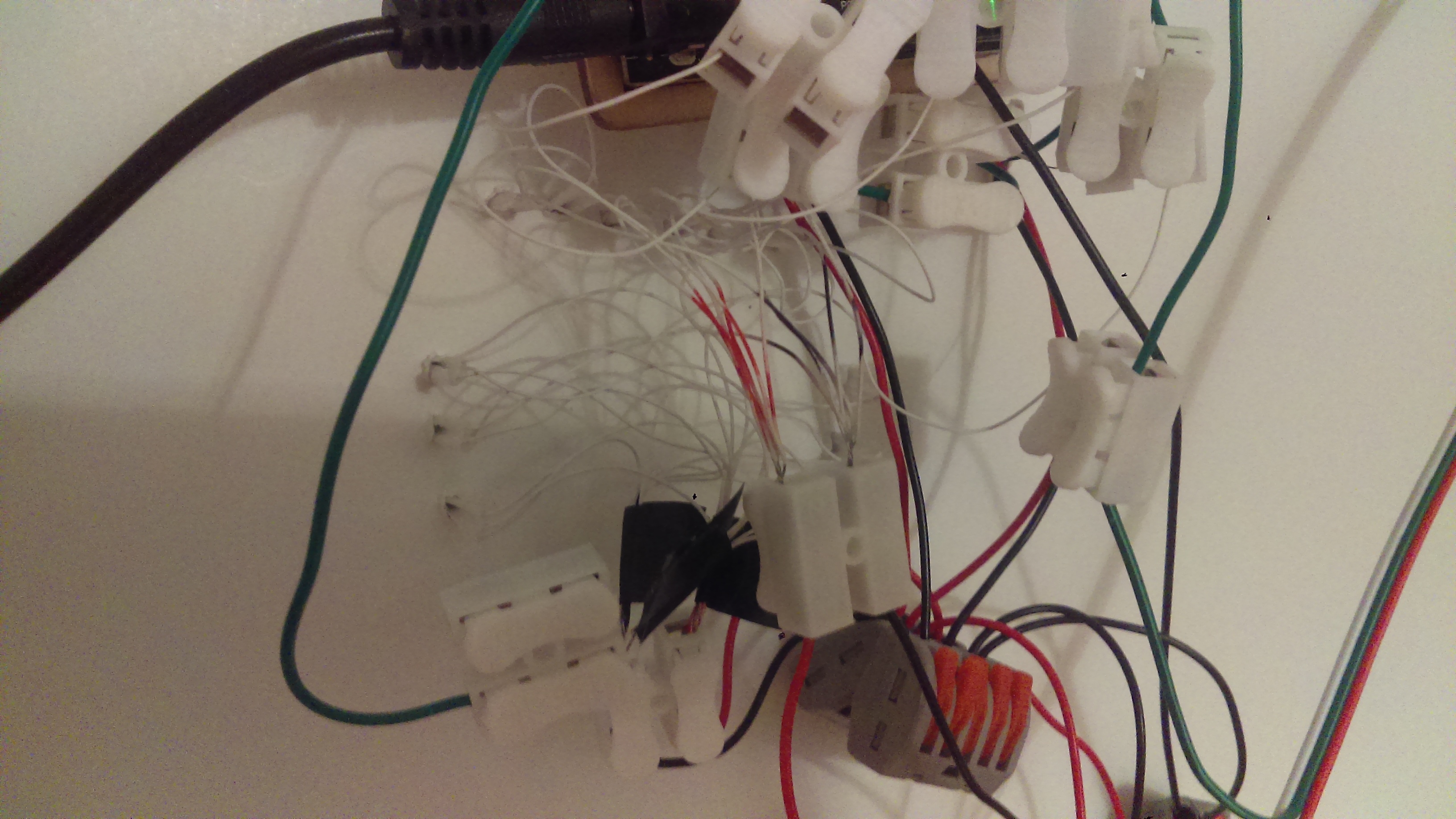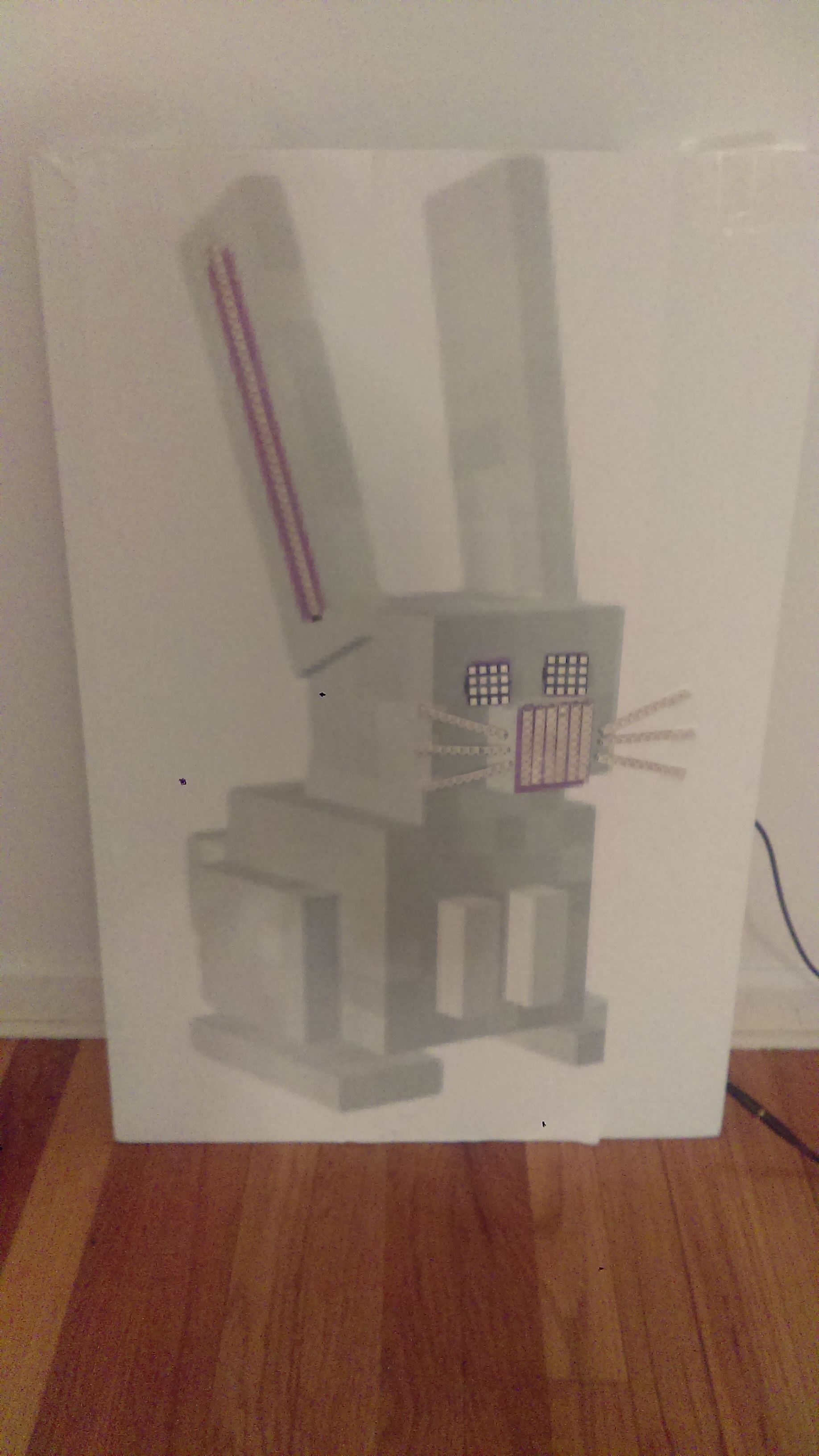 This looks like a cat until you see it in the light and realize the pink stripe is a minecraft bunny ear! I couldn’t get continuity from solder connections on the output end of any of the cut sections, the first time I’ve had this problem, so each piece is controlled from its own pin on an Uno. I originally used a Mega2650/esp8266 combo board but something shorted when I was hanging it on my front door and I lost the board and half my leds! 183 leds aren’t too much for the Uno although it slows when running the Nose Noise Matrix, the noise functions are awesome! The strips are ws2812b 3535 size and 144/m density, soldered with 30gage wires. The nose martrix is made of strip sections. The eye matrices were a good deal and good quality. Spent a lot of time with the hardware so I hope to get more animations in next year.