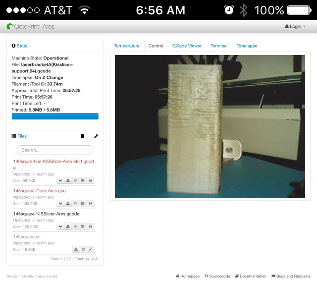 Finally woke up to music to my eyes. (Well, OctoPrint doesn’t carry sound so music to my ears remains elusive.) World’s first Ares 3D scanner’s laser bracket printed on Ares 3D printer! What a world of difference the correct firmware has made.