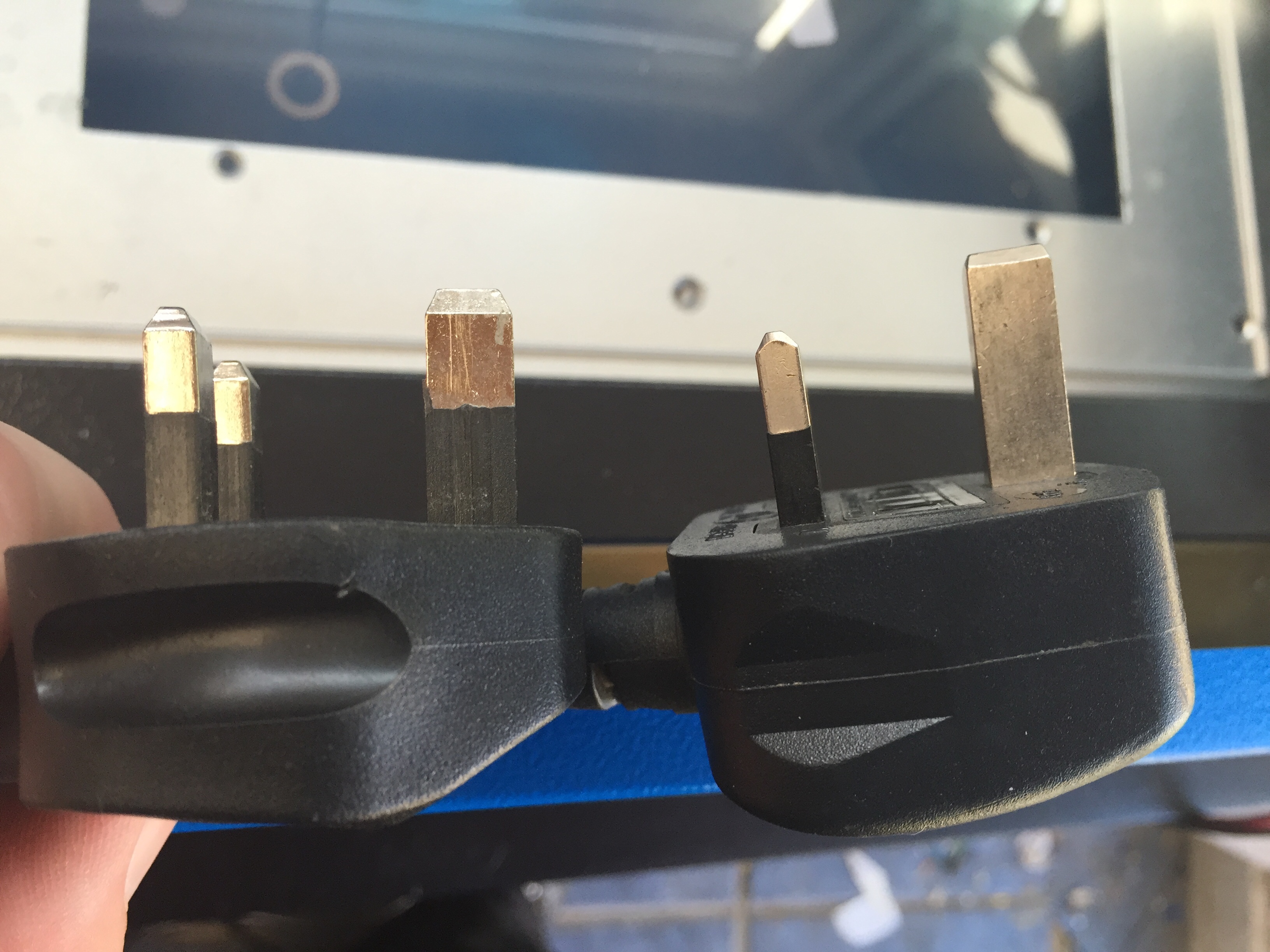 This was the cause of my earthing problems! The earth shielding was too far down the earth pin and was prevent contact (left)! I’ve since replaced the cable and all is well! Thanks everyone for help and suggestions!