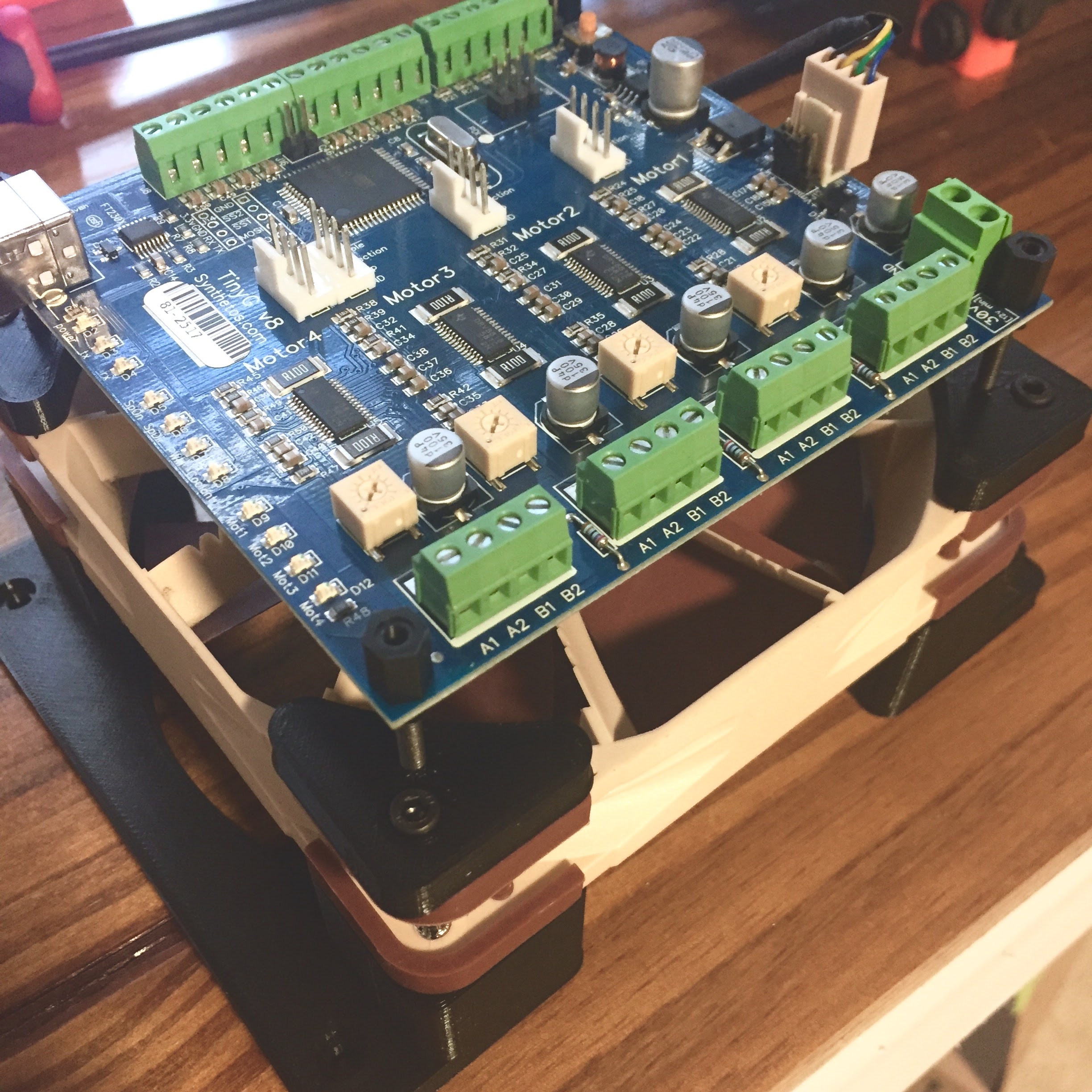 I 3d printed a few plastic bits so that I can mount a 120mm PC fan to the back of the tinyG.