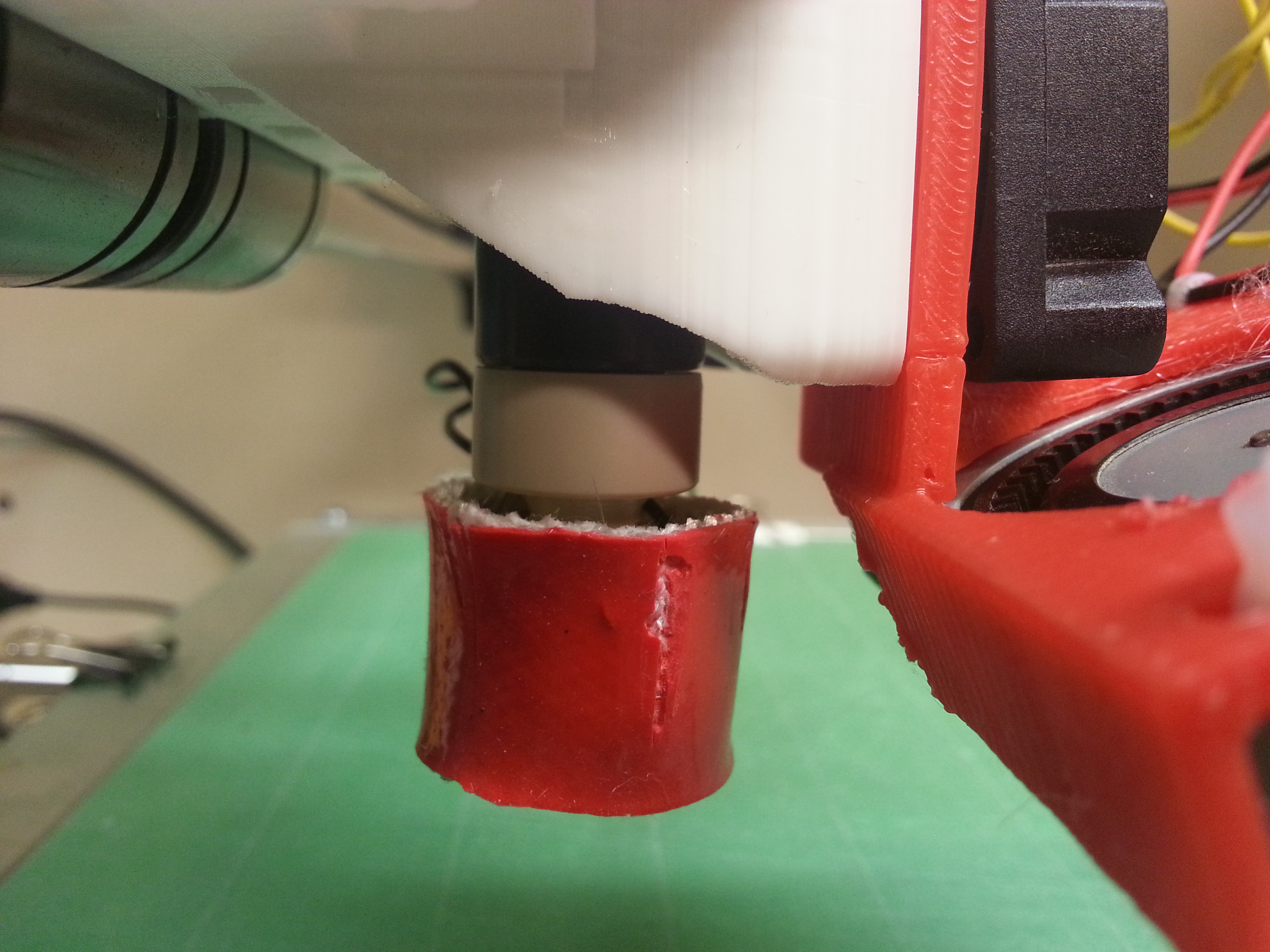 I have trimmed the 2nd sock to match/fit with the first one (still running double insulation), and I’ve lowered the blower fan by about 10mm (not pictured). Currently I’m 1.5 hours into a 5 hour print with not sign of jamming so far.