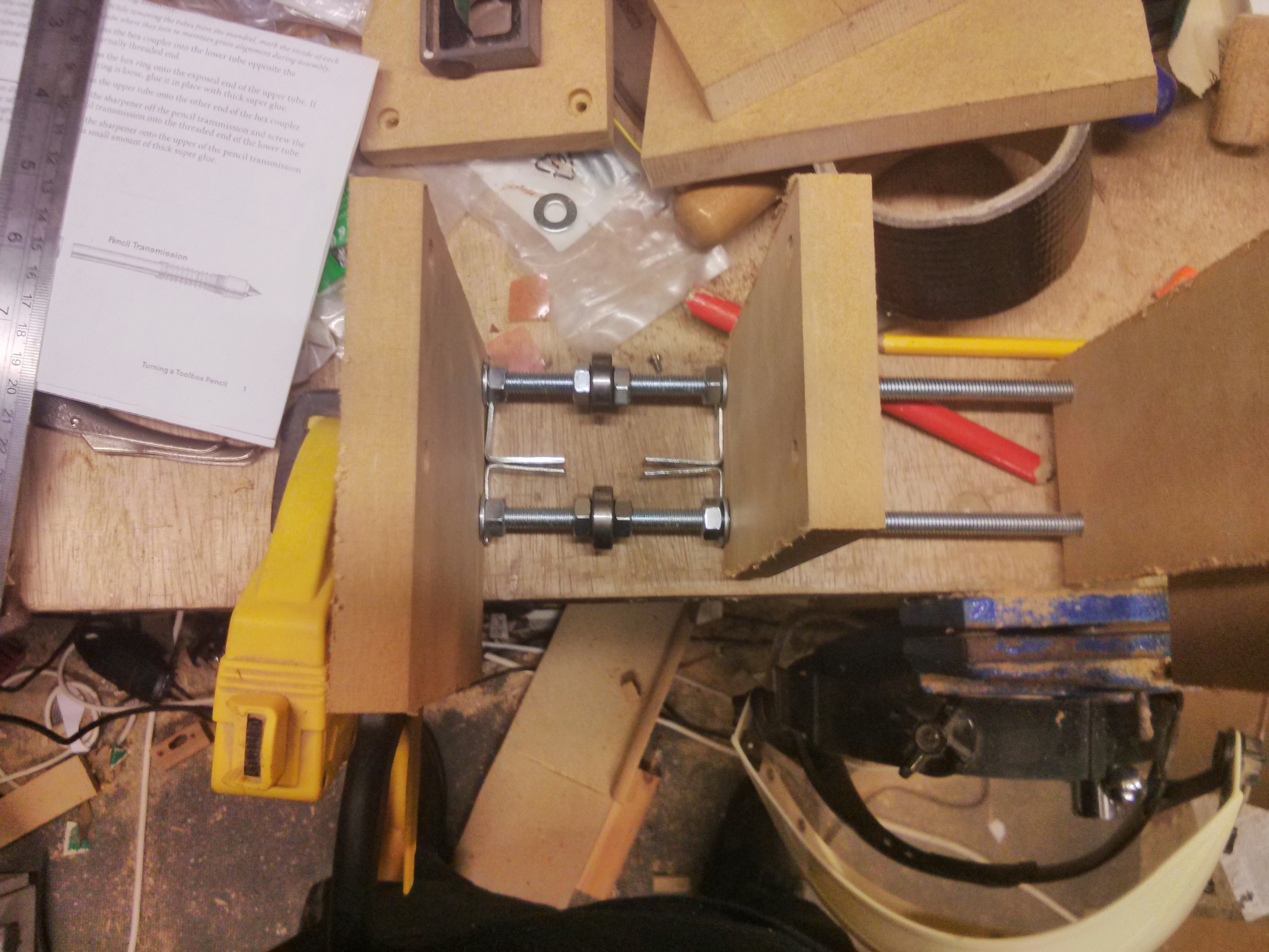 Tinkering with an idea to rebuild my y axis. I think I can mount bearings on all four sides of my square section rails using threaded rod and mdf. The nuts should allow fine tuning of the fit whilst also giving me a y+z axis that has less depth and more reissuance to torquing under heavy cuts.