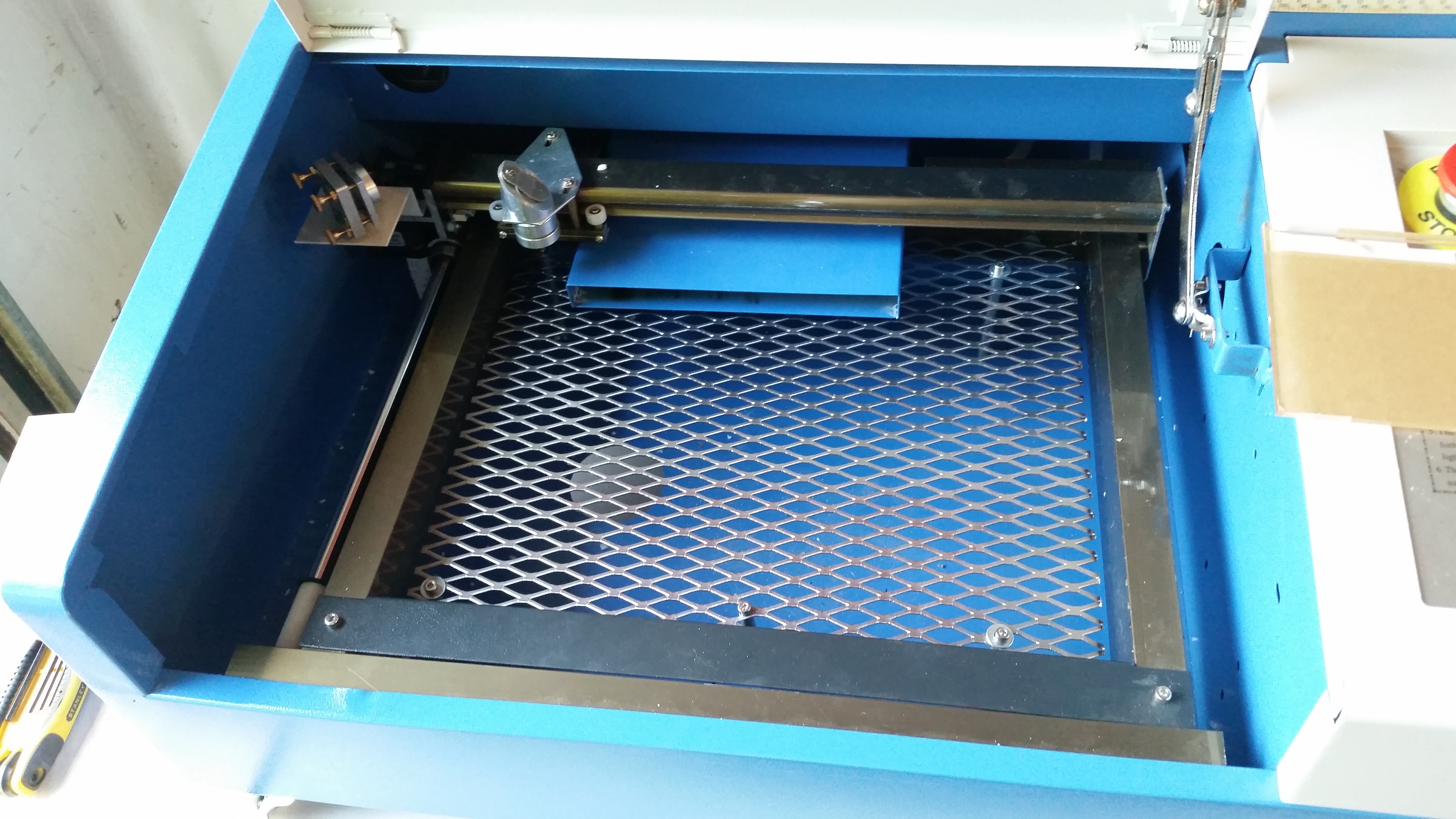 Took a trip down to Home Depot and found this great expanded steel. So much better than the terrible bed that comes with these machines! Only cost $10 for the material. Then I just needed to cut it down to size. Still need to find better washers to better hold it in place, though.