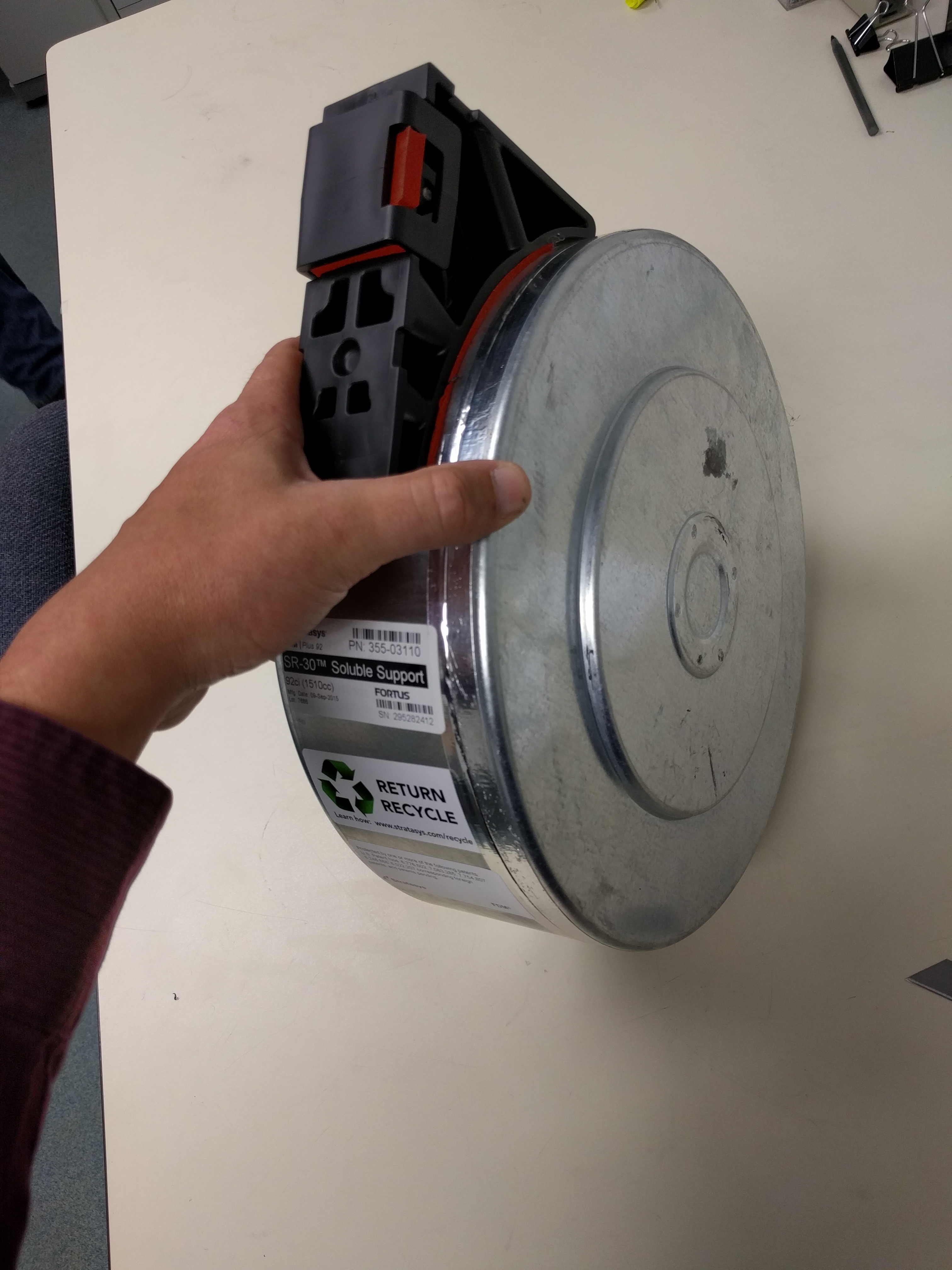Took apart a few rolls of the Stratasys ABS-M30 and SR-30 support material that we use on the Fortus 450 if any one was interested. I thought it was a good idea how they pack the desiccant right in the roll, but surprised by how much material was left after they say it was at zero