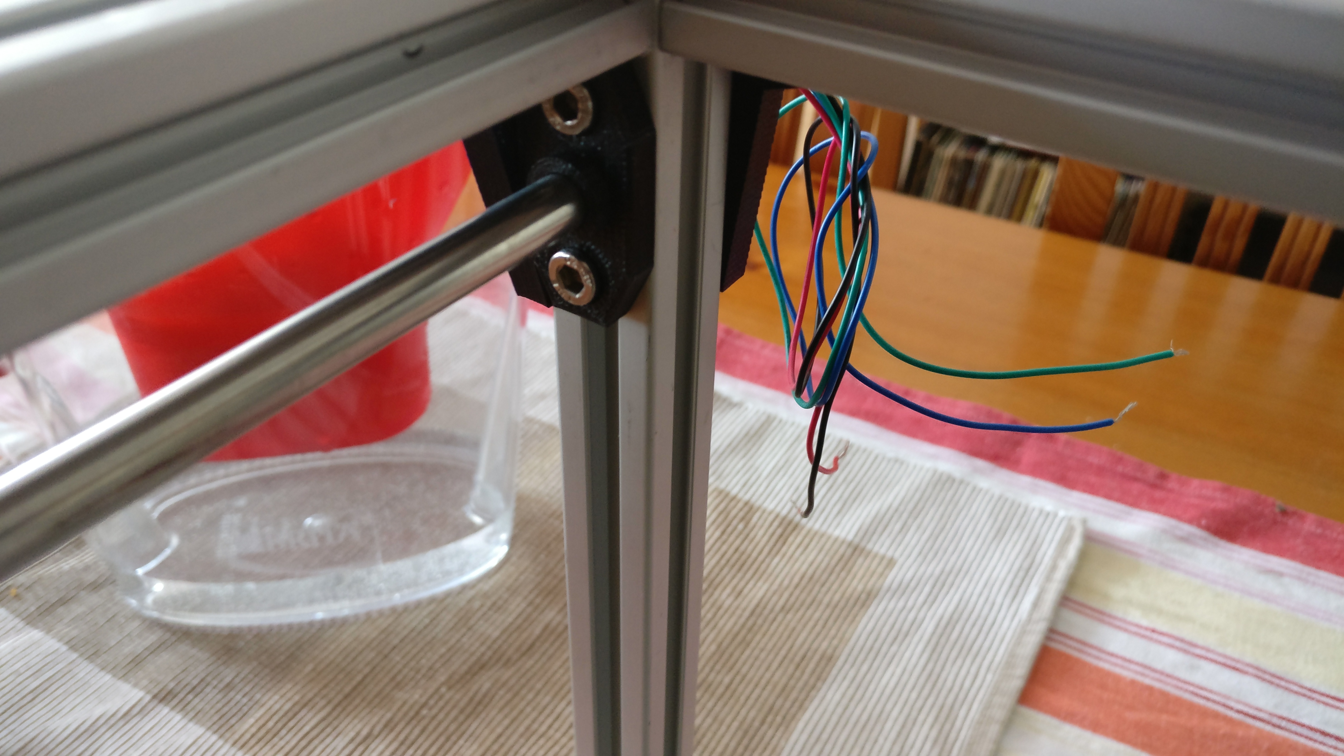 So I have almost finished the mount for the table. When my endstops arrive I will have to figure out the positions to put them. Also I am concerned about the leading rods for the y-axis (first picture). I will probably swap them for rails rails mounted on the outside of the case.