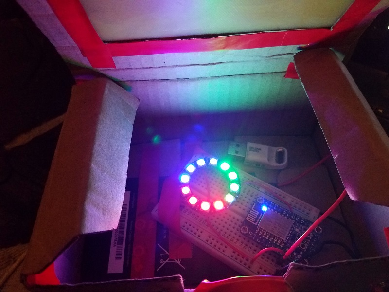 Using chilipeppr/tingy and chilipper/nodemcu to make a small box that can be turned on and off by a web page. USB dongle is there to give a size reference. The Box is about 2"x 4" x 5".