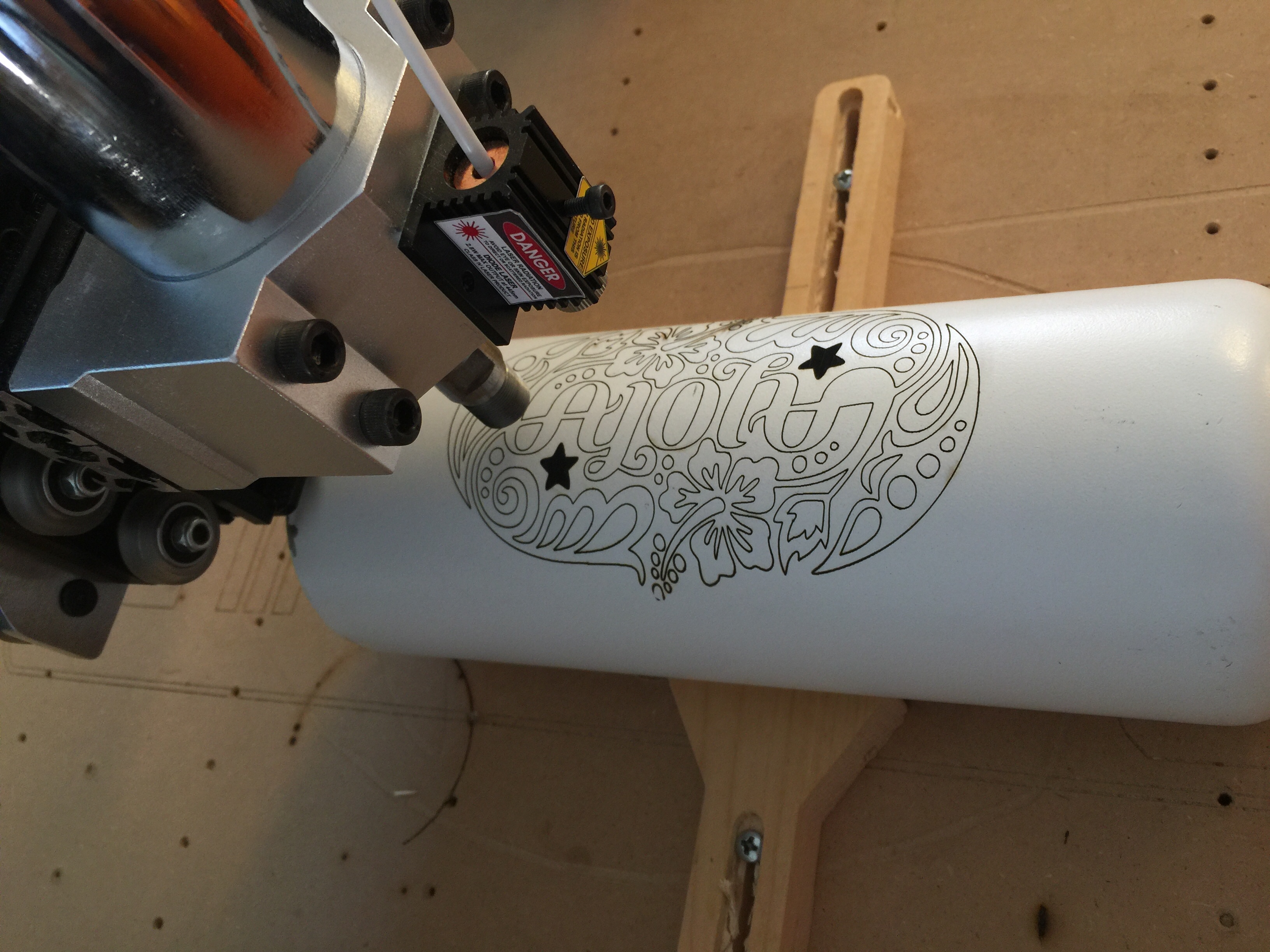Wanted to share an update with how well the laser is working with my OX. Here are a few pics of a laser engraved water bottle I did. It’s not perfect but coming along well. What I really need is to add a 4th axis so that I can keep my focal point the same while the 4th axis rotates the bottle instead of the X axis moving back and forth over the curvature of the bottle cause the beam to go out of focus.