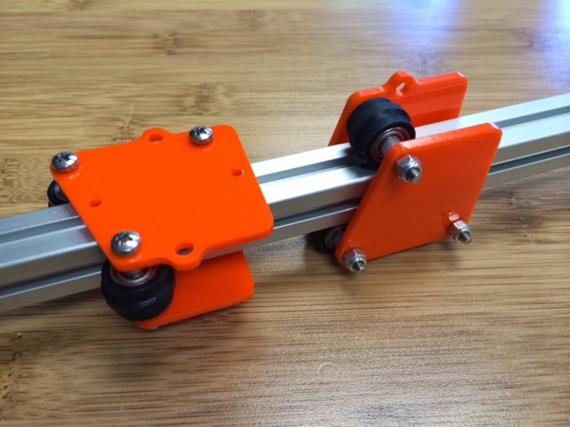 These are precision cut to fit Misumi 1515 aluminum extrusions without any offset nuts or any required tightening of the wheels. The front of the carriage also has 2 mounting holes that are 35mm apart for mounting joints for the arms. Each carriage is tested prior to shipping.