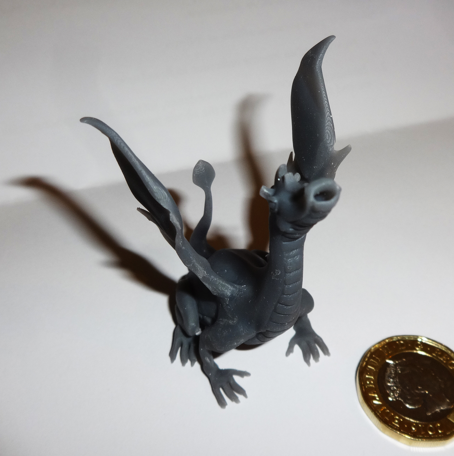 My Form 2 arrived yesterday and the first print off the bed was this - the Adalina Dragon. This is just 70mm high (the coin is a UK pound), so this thing is tiny and the detail is simply incredible. Parts of the wings are paper thin, the horns razor sharp, the tail is beautifully detailed with scales, even though it’s only 2mm or so wide, and you can clearly see the toenails on the claws and, of course, the whole thing is completely smooth.