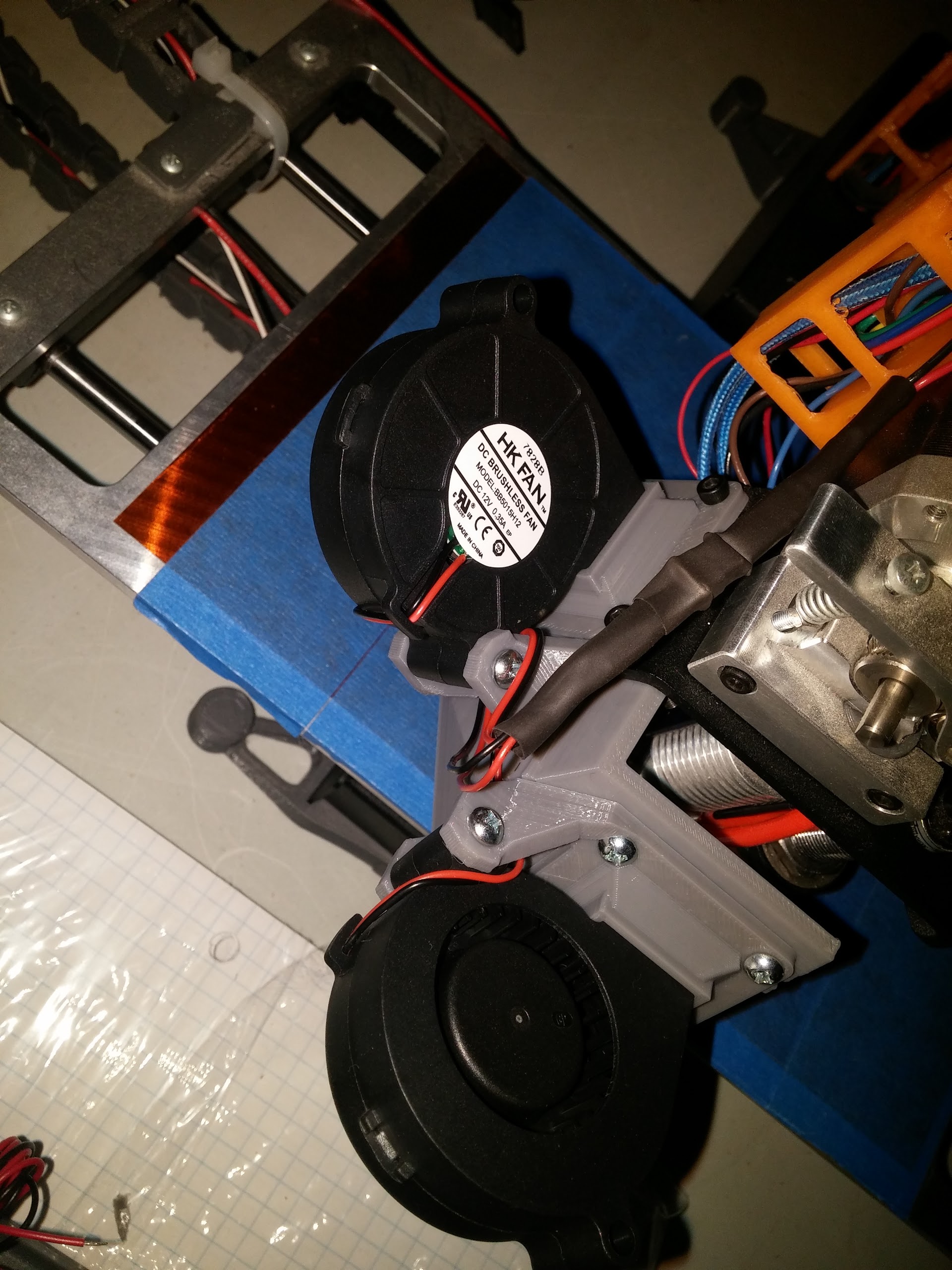 Well it sure took longer than I though, but my dual blower fans are up and running! I pulled this desing off of thingiverse and am desingning my own for a more permanent design