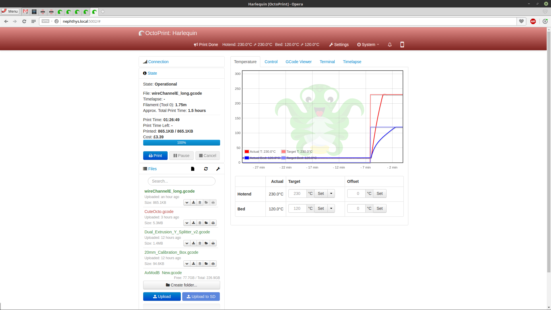 Well the Aluminium plate and 230v 200w Mains heater arrived for the newest FB2020. Love these heat up times… awww yis… ~5 min to 120c on the bed and I’m pretty sure it’ll go higher. I’m only using the ally plate as a heat spreader, as I’m planning on putting PEI on top, it’s just that and getting the Re-ARM in and it’s done.