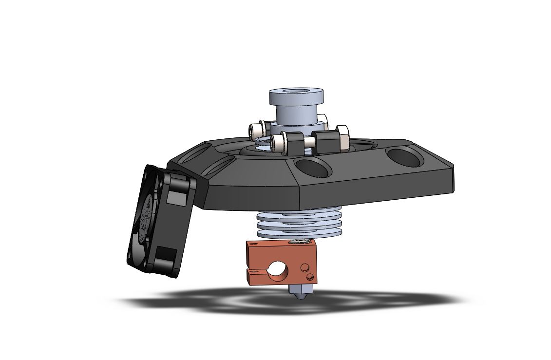 The idea is to reduce vibrations grabing the hotend with larger radius and nearer of the mass center, also optimice the use of cooler.