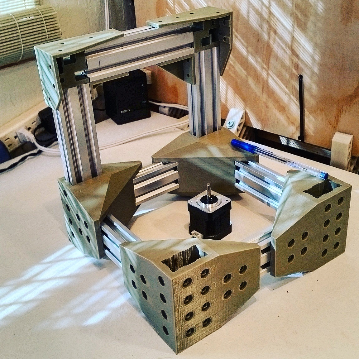 @Ryan_Carlyle : I currently have aluminum brackets on my bot: but my printer is so tall (z build height around 21", 12" on xy), I feel something like this could be better. Not to mention, and the main reason I printed them: They help self-square the whole thing. The tolerances are so tight, there’s no slop in any of it, so you just slide everything in place, bolt it up, and technically, a whole bunch of the squaring-pain I’ve gone though in the past is just gone. All just theory of course, I’ll find out if that’s true once I take the current machine apart, and reassemble it with all this new stuff.