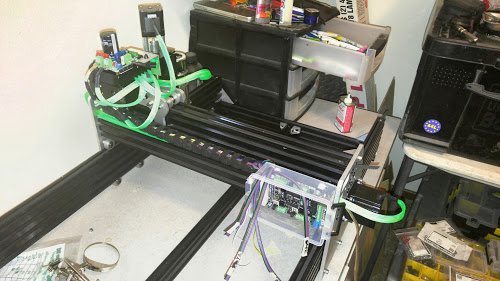 I currently have my TinyG and speed controller on the back side of the X-axis. However, I’ve had a couple of jobs die on me from a disconnection that I’m starting to suspect was caused by EMF noise from the spindle being so close (my USB cable is a pretty good shielded one).