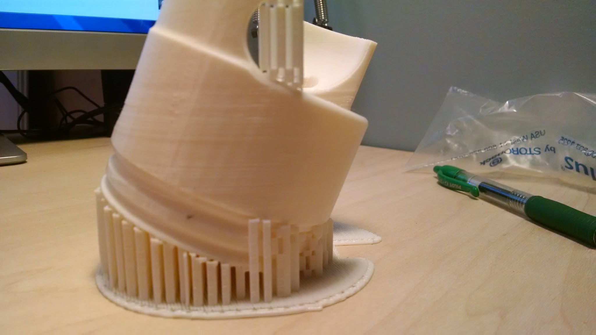 Simplify3D truly is perfect at support material - bottom face is stringy, yes, but next layer is watertight. Sanded it down on a giant wheel and hit it with acetone and it’s as good as any.
