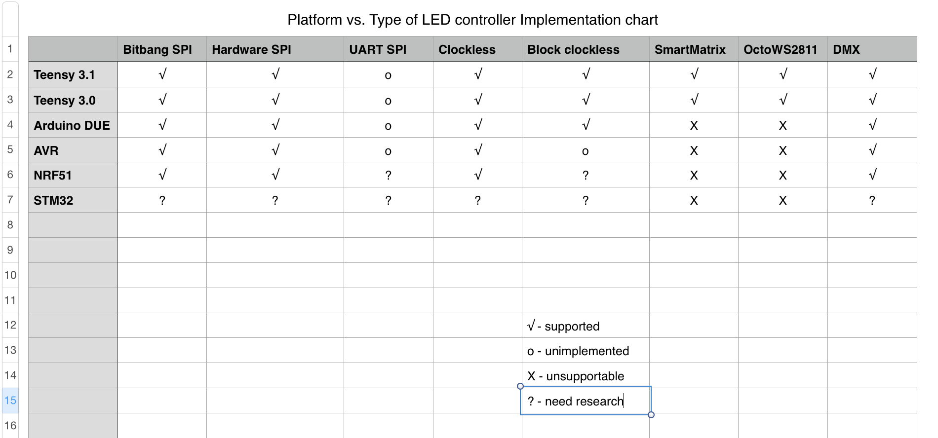 Why testing the library can be a nightmare sometimes. The chart below shows the types of LED control that the library supports (or plans to support) charted against the hardware platforms that are supported. (I could probably collapse the teensy 3.0/3.1 columns, but when I did the first version of the chart, there were enough differences that I had them separated out).