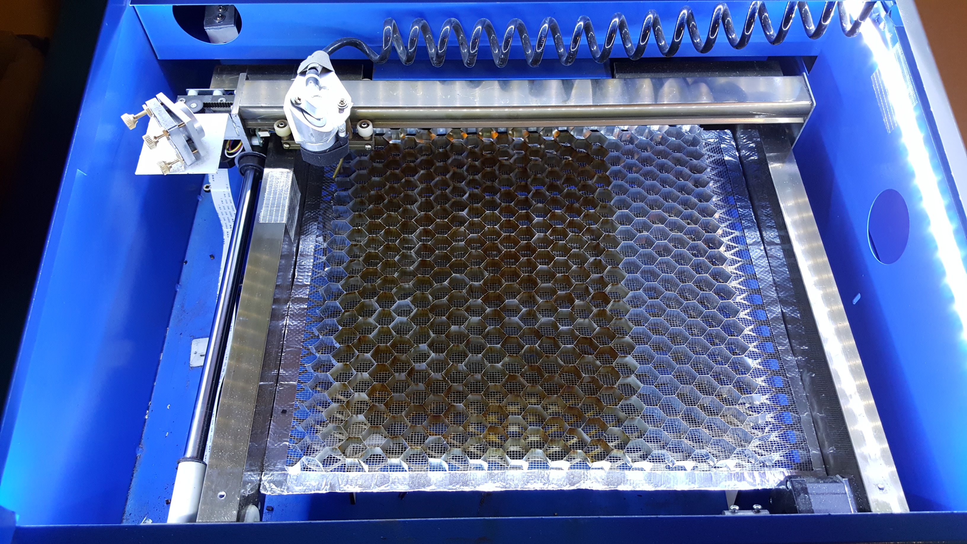 With the new lens I finally added a honeycomb. This is a .5 inch pattern that’s .5" thick. It’s resting on a steel welding mesh that’s covered with an aluminum screen mesh to catch the tiny parts I’m often cutting. There is no noticeable marking from the laser reflecting off of the mesh. I created a few sets of standoffs from 5mm plywood in varying heights. This lets me set the focus for common materials that I cut, specifically 5mm, 3mm and paper. I just picked up a steel right angle ruler that I’ll install as a guide to allow easy placement at 0,0. This will also make it easier to turn Tie Fighter panels over to texture both sides. Finally, I stalled a strip of LEDs around the interior. It’s pretty bright in there!