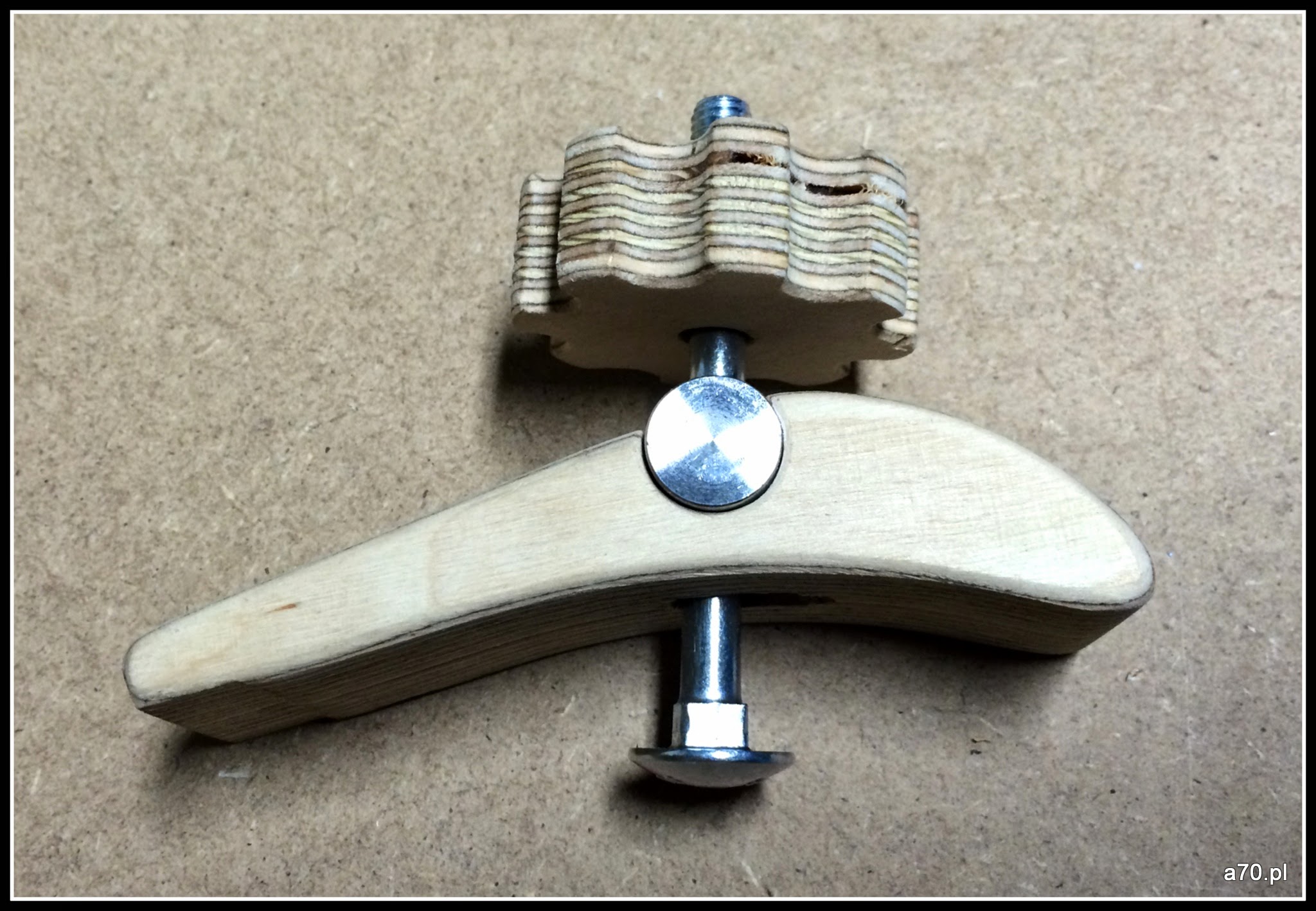 Wooden clamps for my DIY CNC. Drewniane zaciski do DIY CNC wykonane ze sklejki wodoodpornej dodatkowo zawoskowana, śruba M8, nakrętka kłowa M8, walec ze stali kwasoodpornej i gotowe.