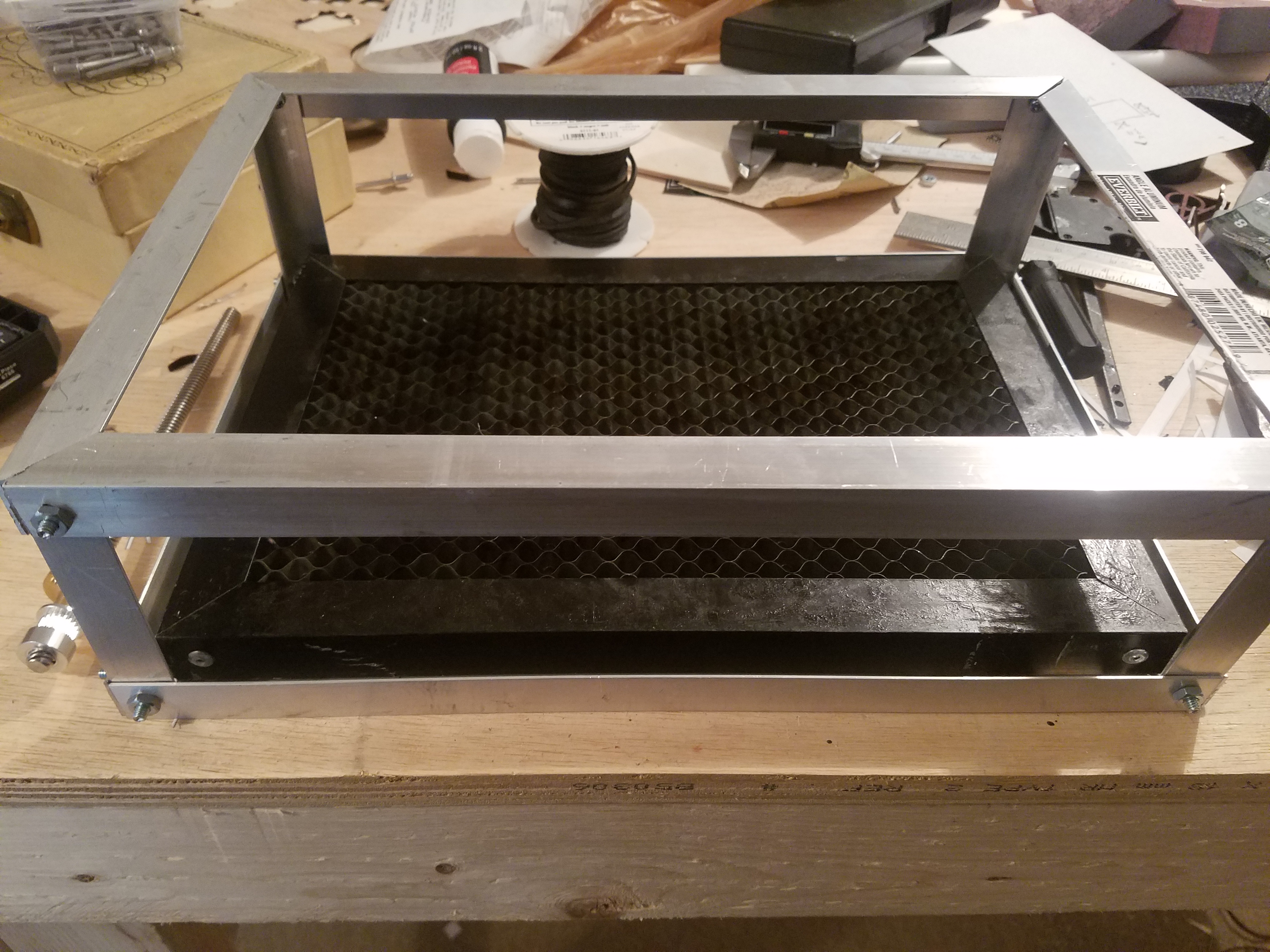 Working on a custom made adjustable bed for my K40, i just made it out of aluminum angle, nuts and screws. I still need to attach the mounts for the lead screws and the mount for the motor.