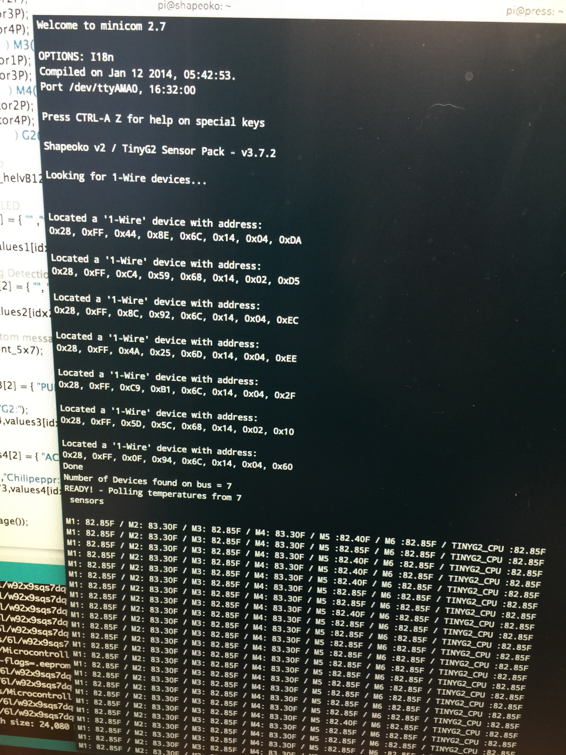 Working on a sensor pack that checks the temperature of each stepper driver and the TinyG2 (Due). (In the picture I was running a 4 axis job - So X, Y1, Y2, Z & A. The 6the driver (B) is connected, but with no stepper) Then reports the back to the RPi. If the MCU detects a driver running way too hot, it pulls and holds the reset button, then a local script on the RPi trigger and sends me a pushover notification. The goal is to create a ‘widget’ for chilipeppr and create a graph of all this. There is also a local 7" TFT touchscreen that shows the same info, but will also act as a DRO and pendant (WIP). (Still working on the SPJS part)