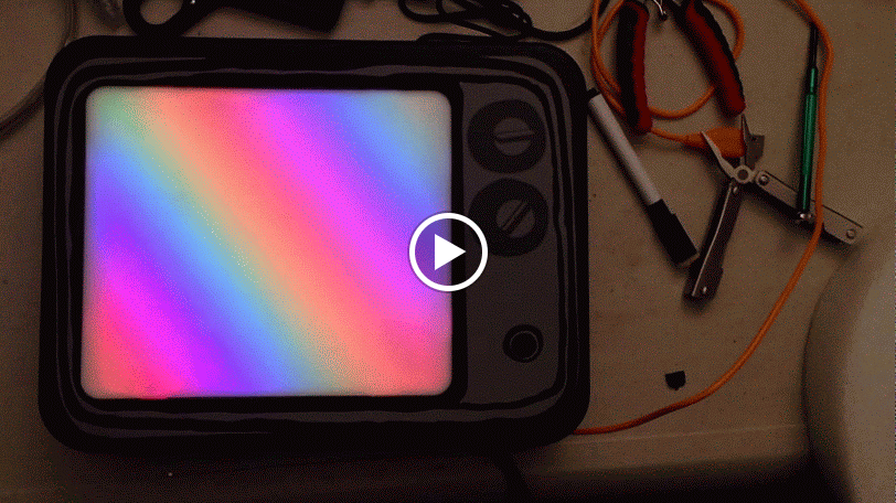 16x16 matrix (256 pixels) driven by an Arduino Nano, plastic diffuser, and faux TV.